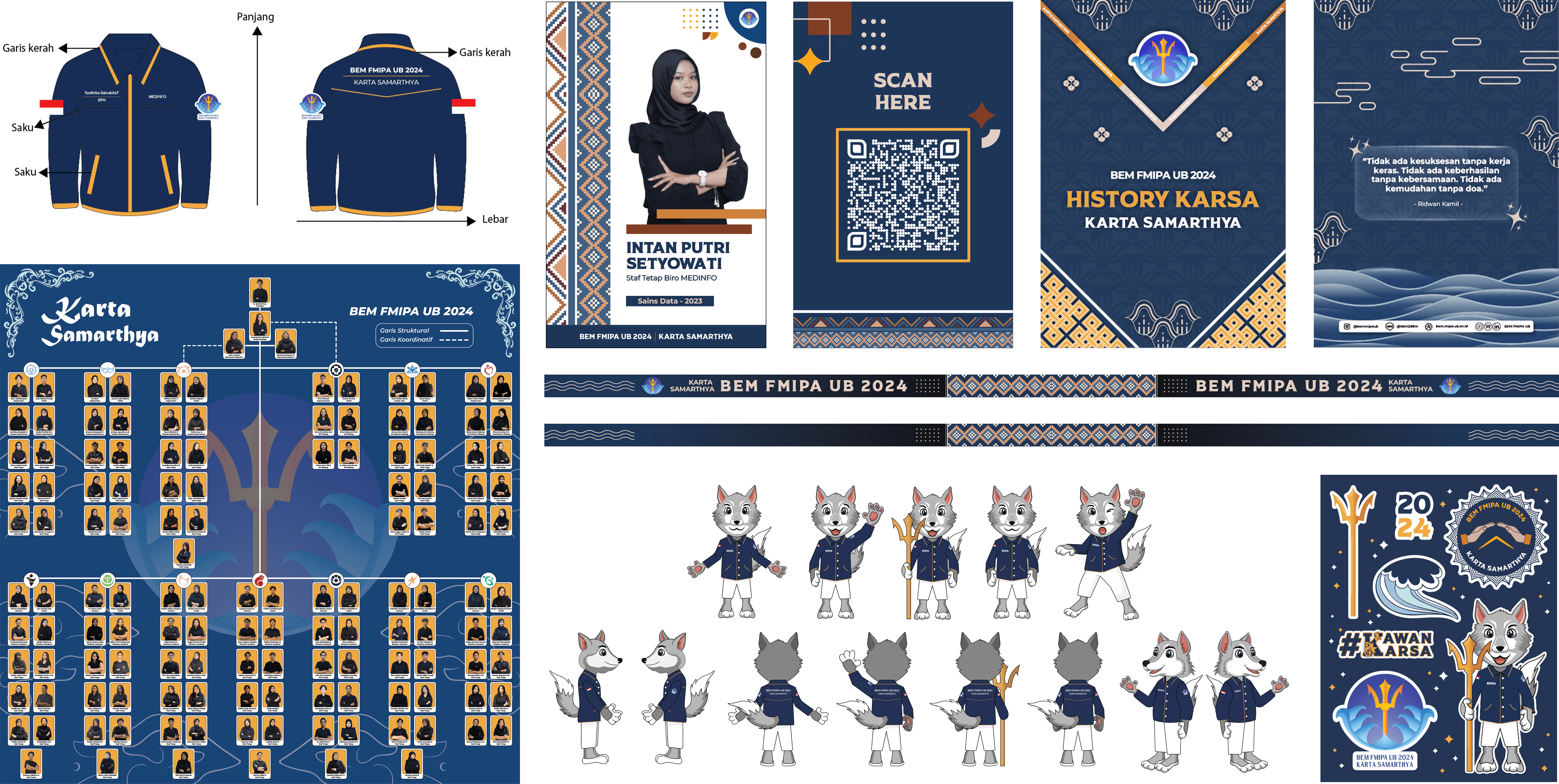 This design project includes the official uniform (PDH), ID card, mascot, notebook, sticker pack, grand design presentation, and organizational chart, all created under a modern Javanese theme. It combines traditional elements like batik patterns and navy blue tones with a clean, modern visual style reflecting both local identity and contemporary leadership spirit.