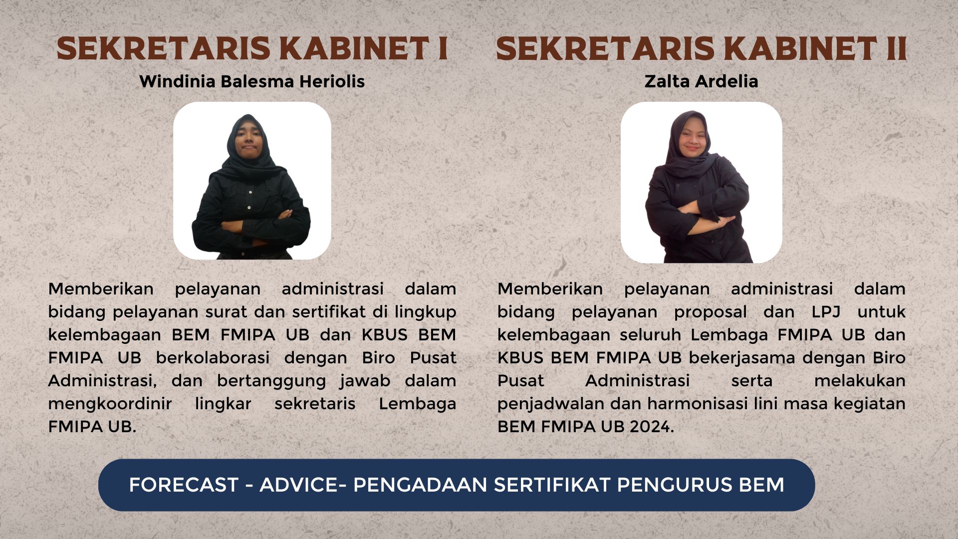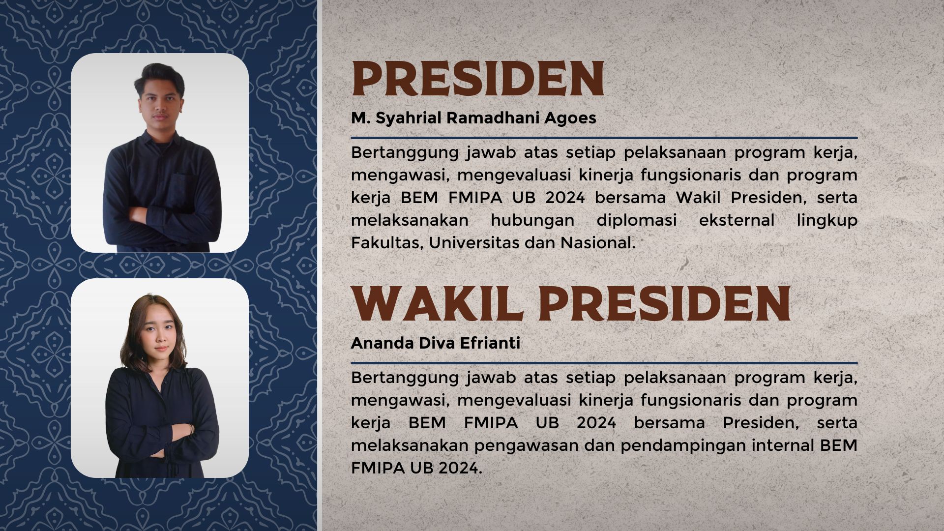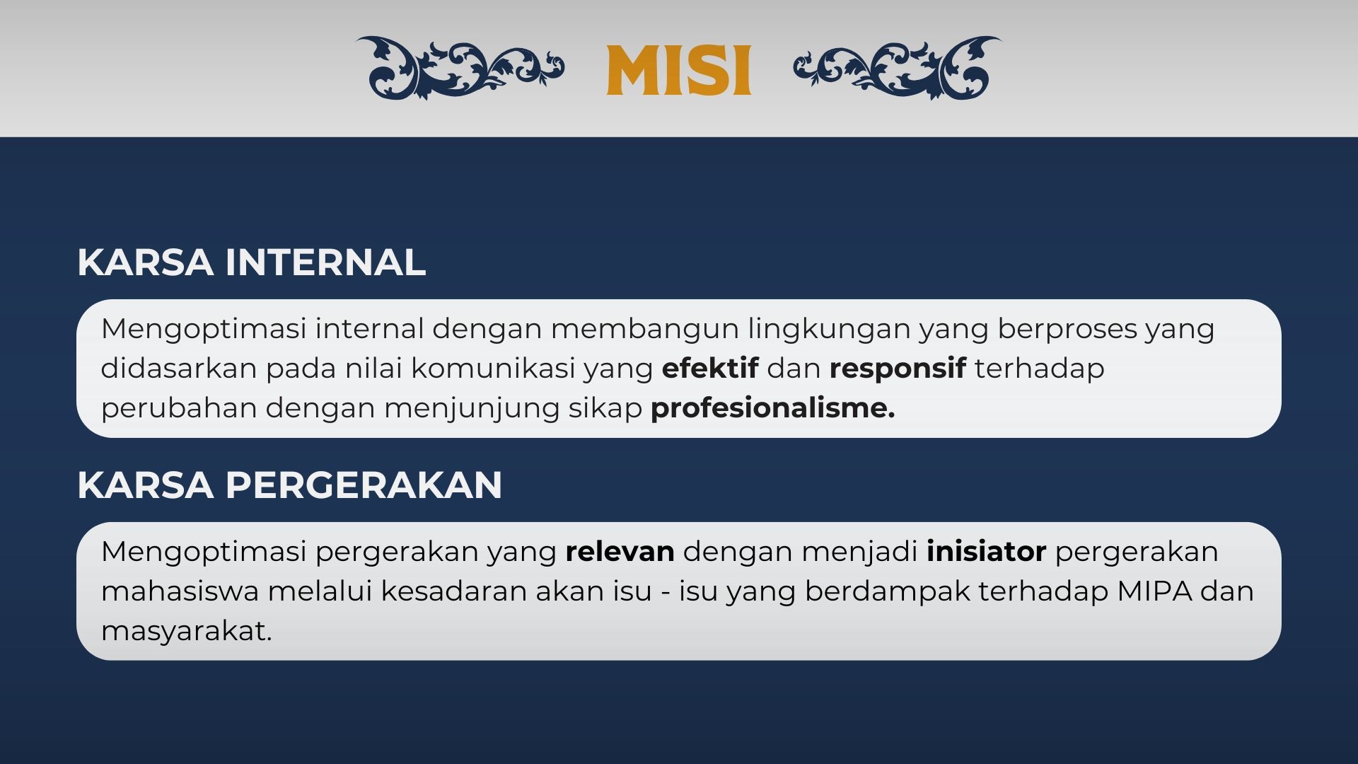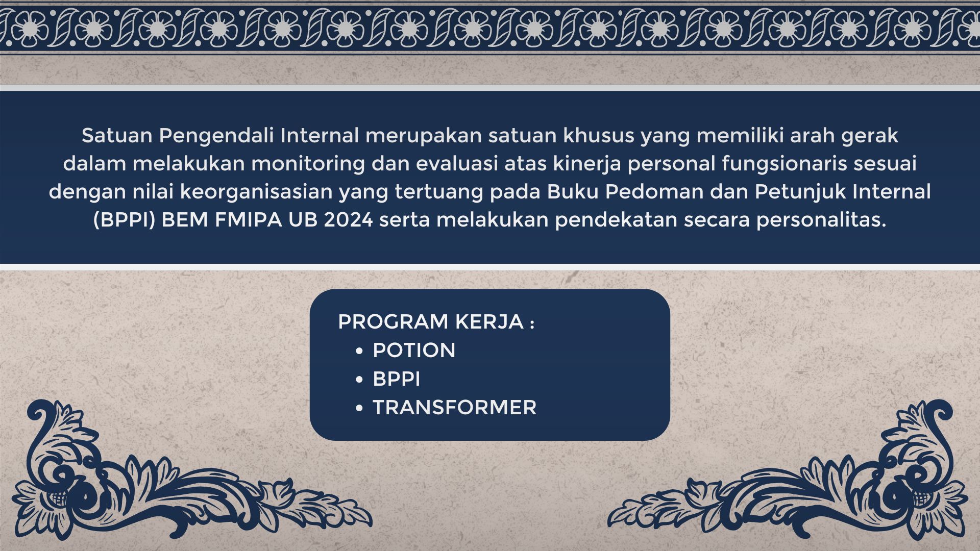 Setiap pilar mencerminkan arah strategis BEM dalam menciptakan kebermanfaatan bagi mahasiswa FMIPA. Struktur organisasi dibagi dua: