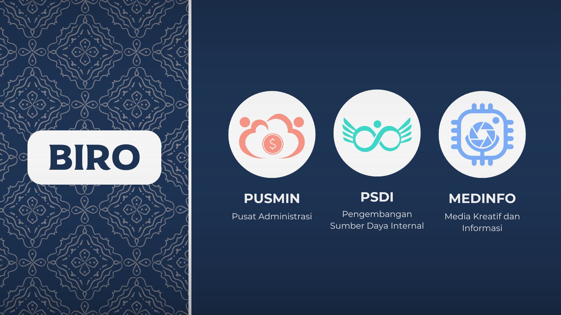 Biro/Unit/Satuan: menangani media, administrasi, pendidikan, kesadaran sosial, dan pengawasan internal.