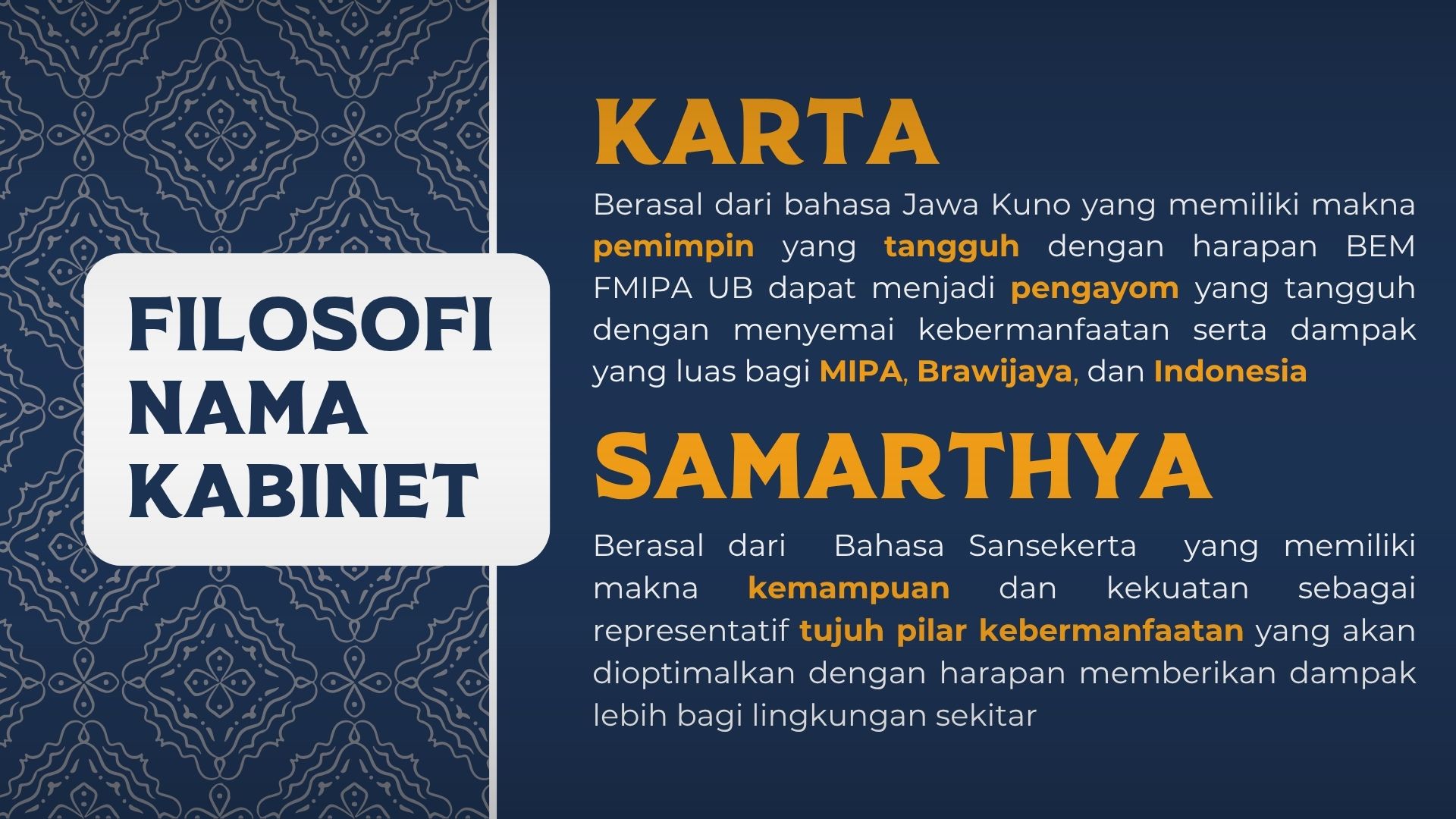 Infografis ini menggambarkan Kabinet BEM FMIPA UB 2024 sebagai sebuah rumah bernama "Karta Samarthya".