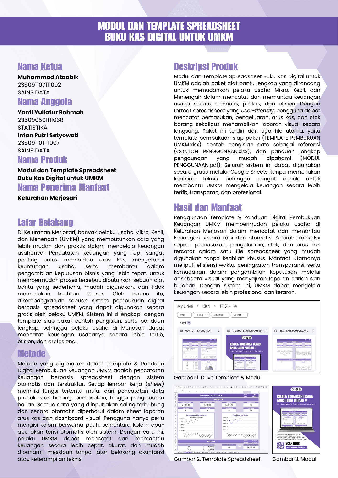 This project empowers small businesses in Merjosari with a ready to use digital bookkeeping system built in Google Sheets. It features automated templates and a modular guide to help MSME owners track income, expenses, cash flow, and inventory with ease. Visual dashboards turn financial data into clear, actionable insights even for users with minimal tech experience.