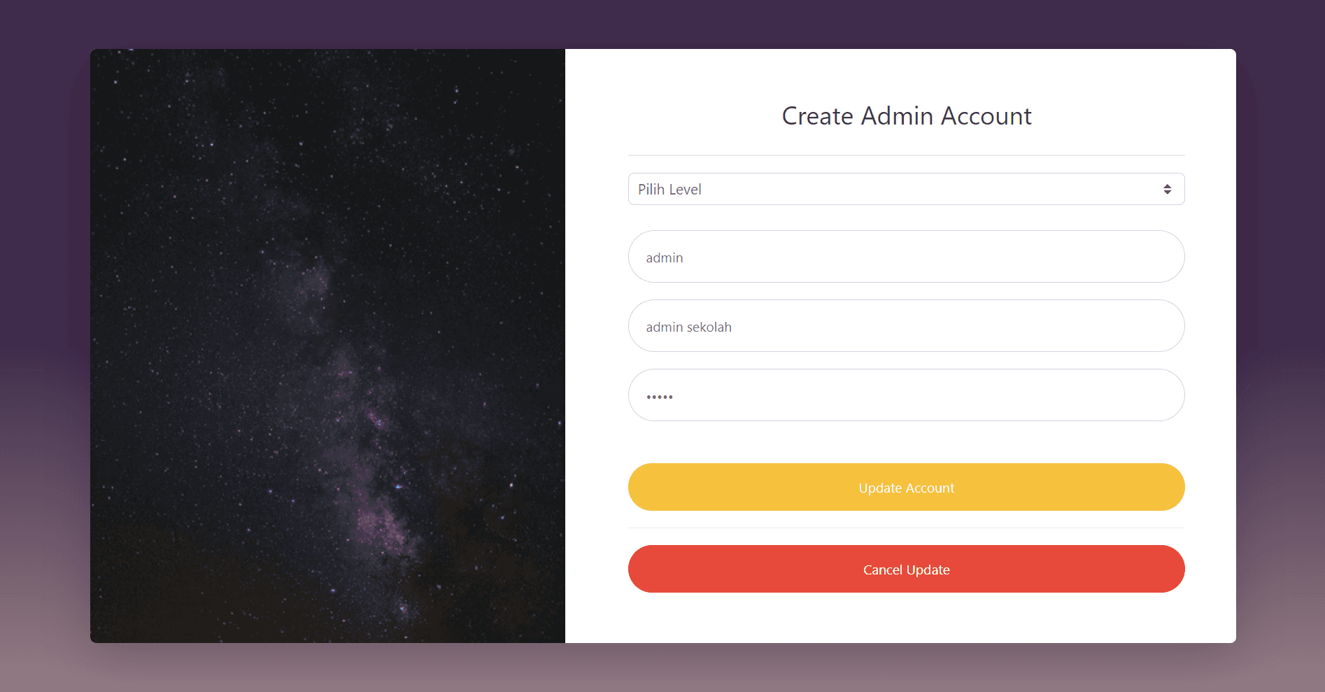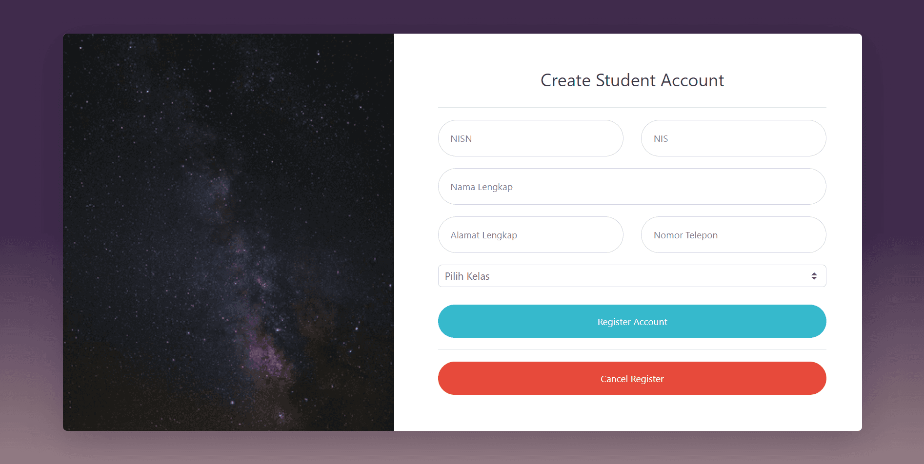 Registration forms for creating admin, staff, and student accounts with required personal and login details.