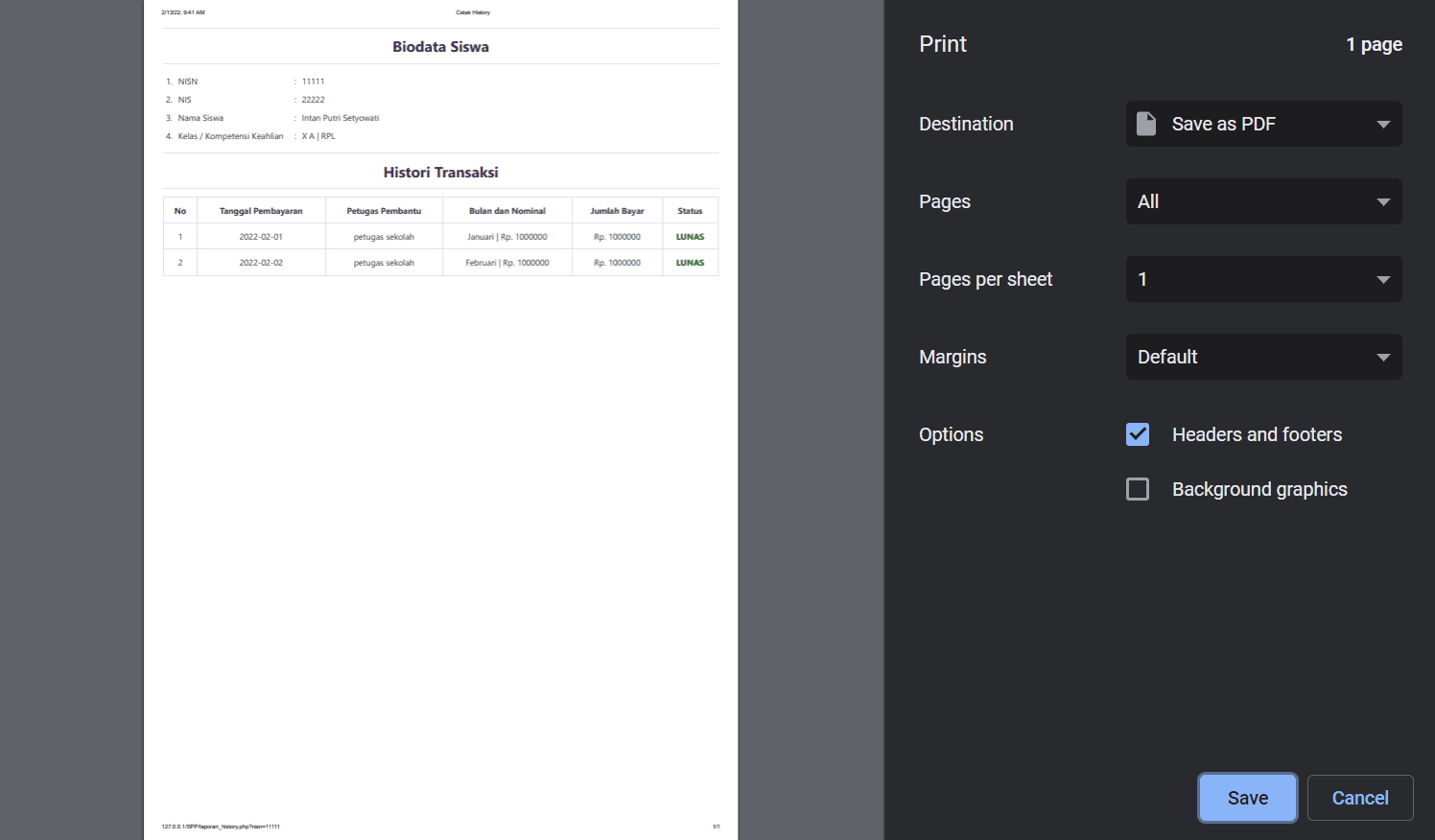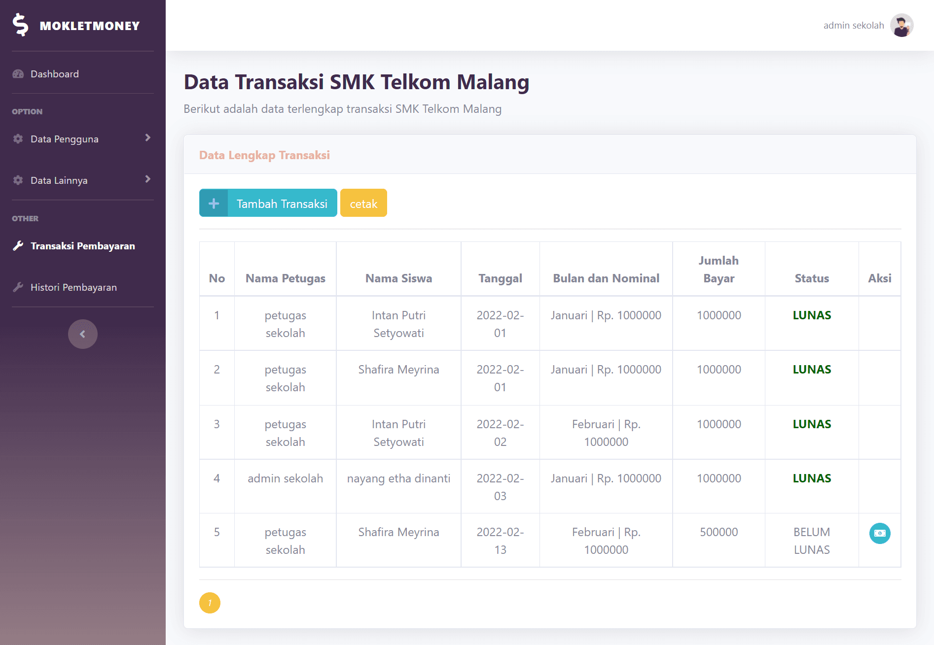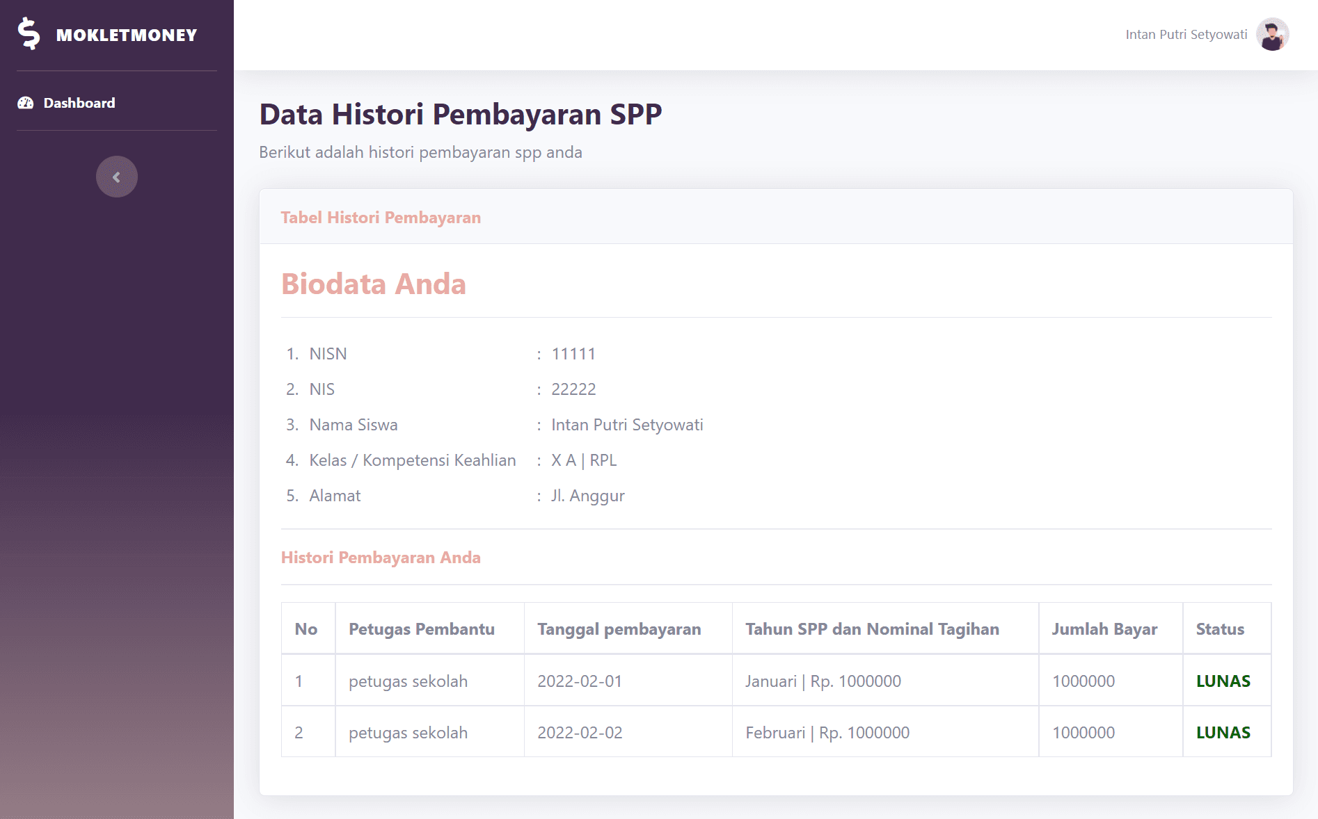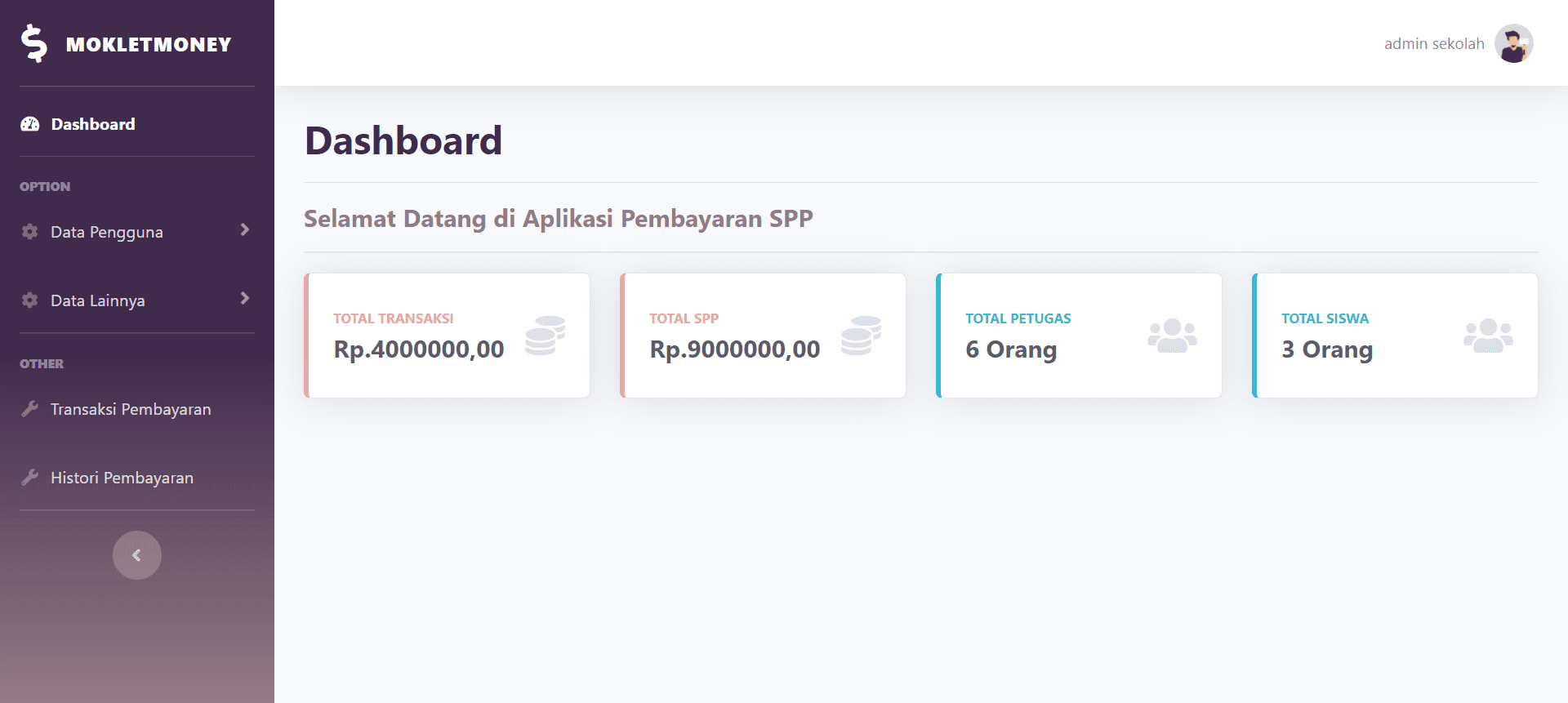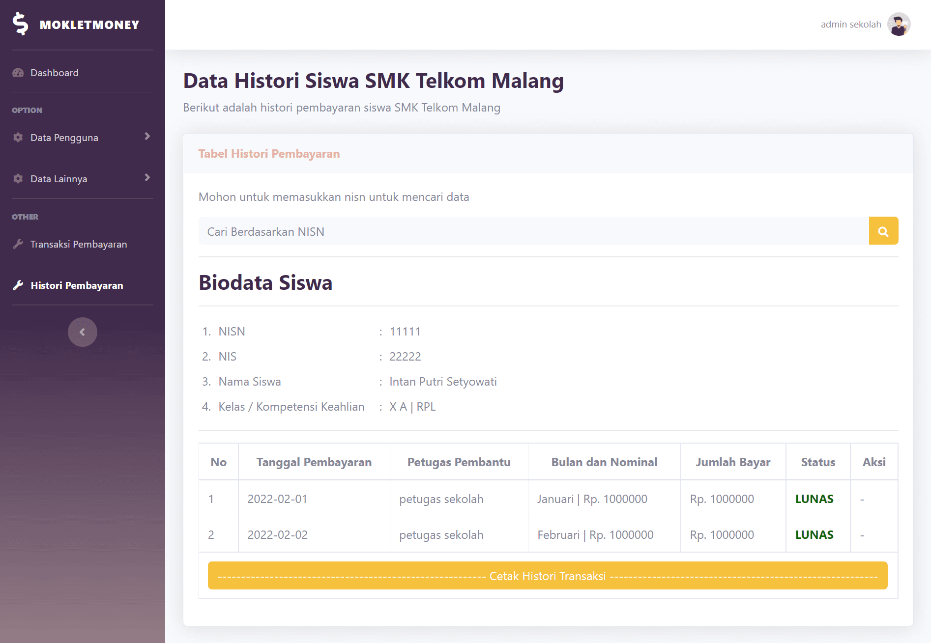 This is a simple school payment management website built using PHP, HTML, CSS, and MySQL. It includes authentication for both staff (with admin and regular staff roles) and students. The system supports full CRUD functionality for managing staff, students, classes, SPP, and payment transactions.