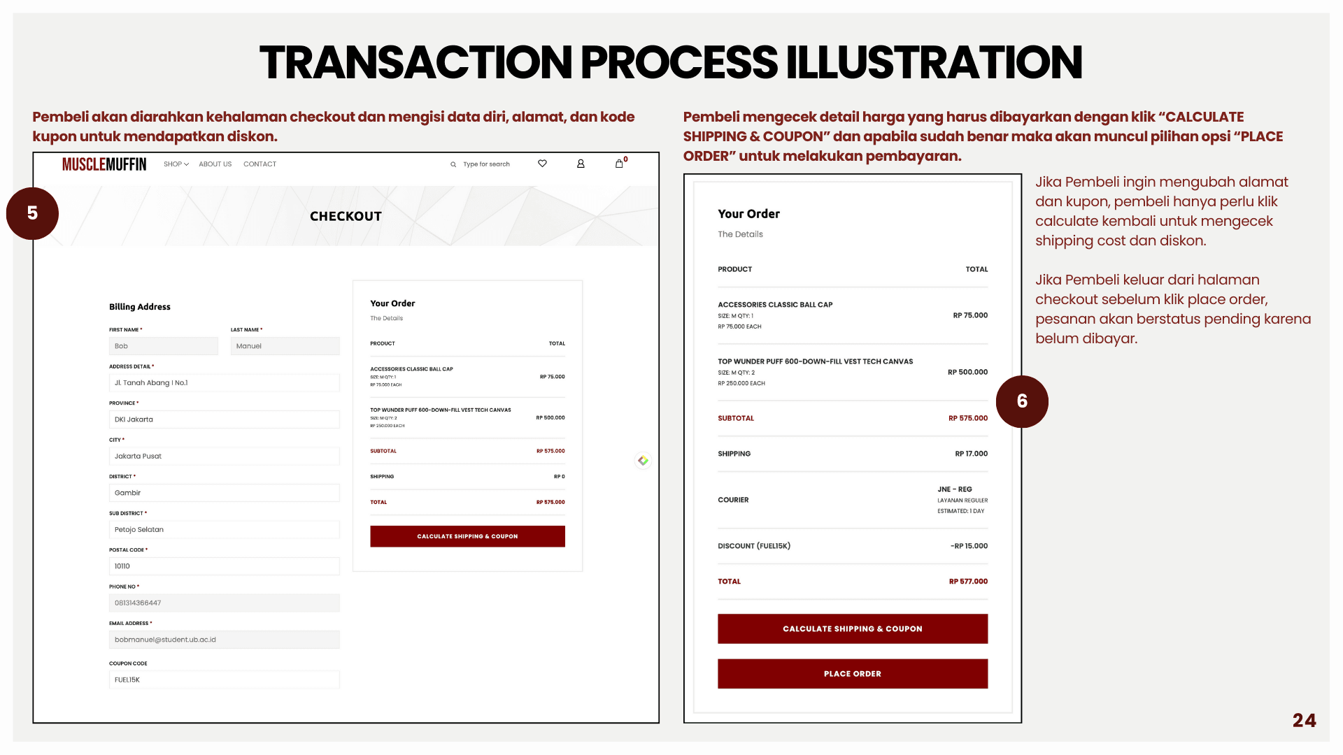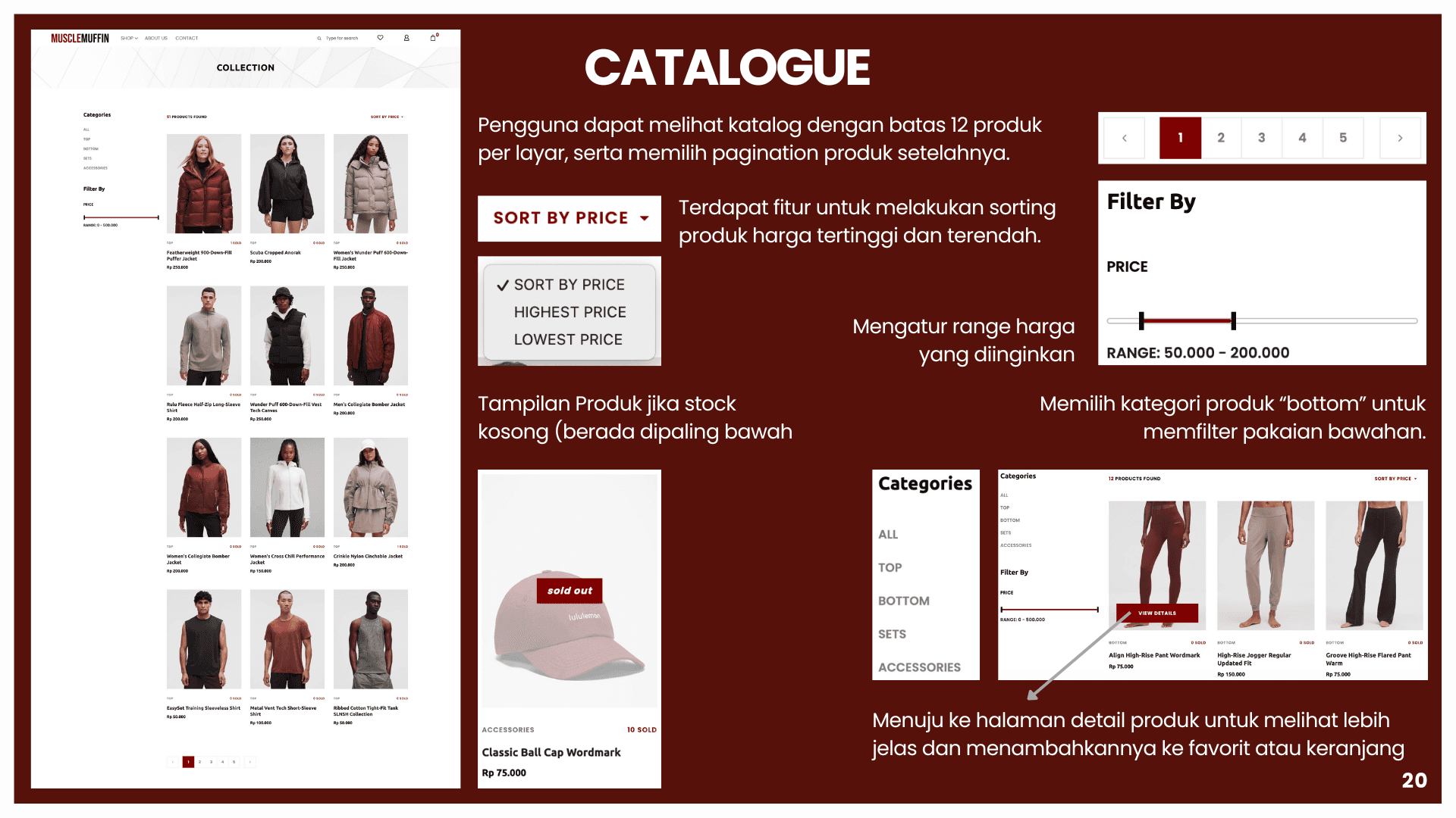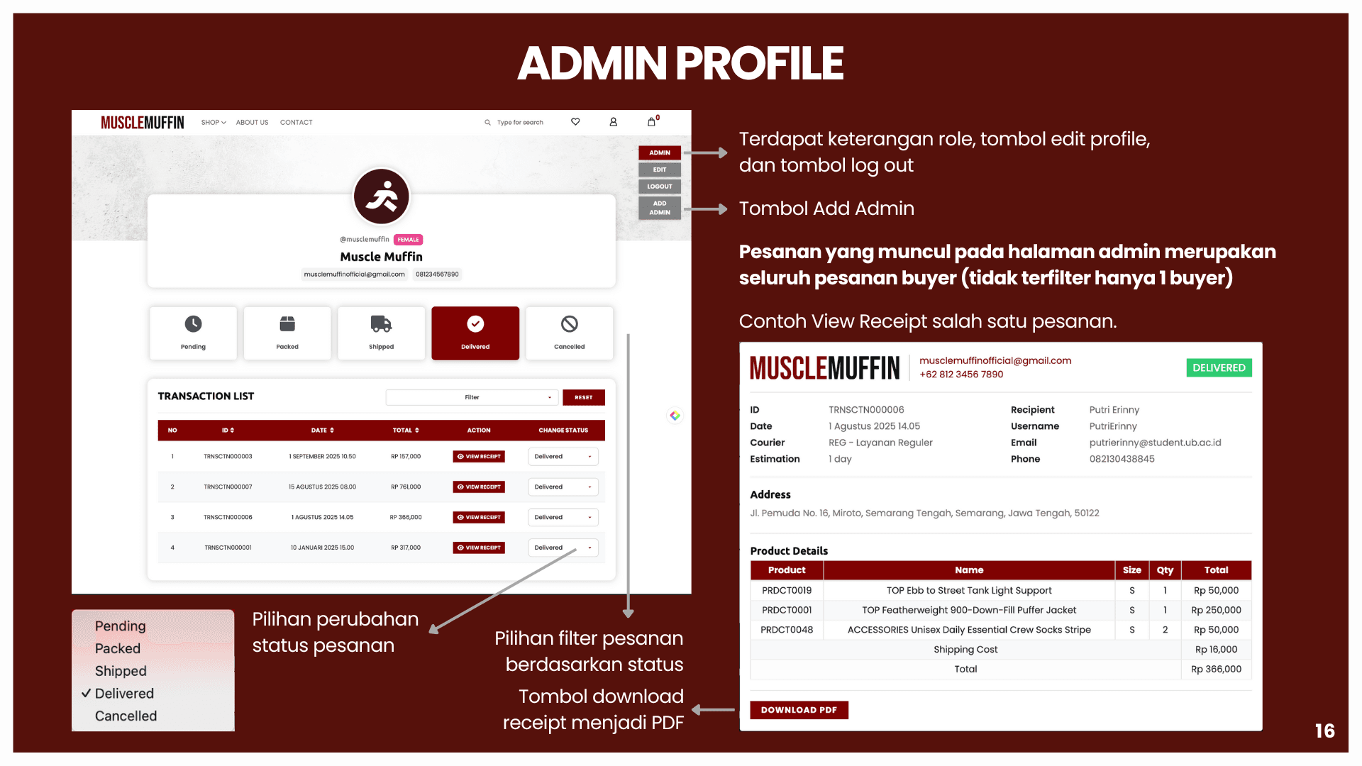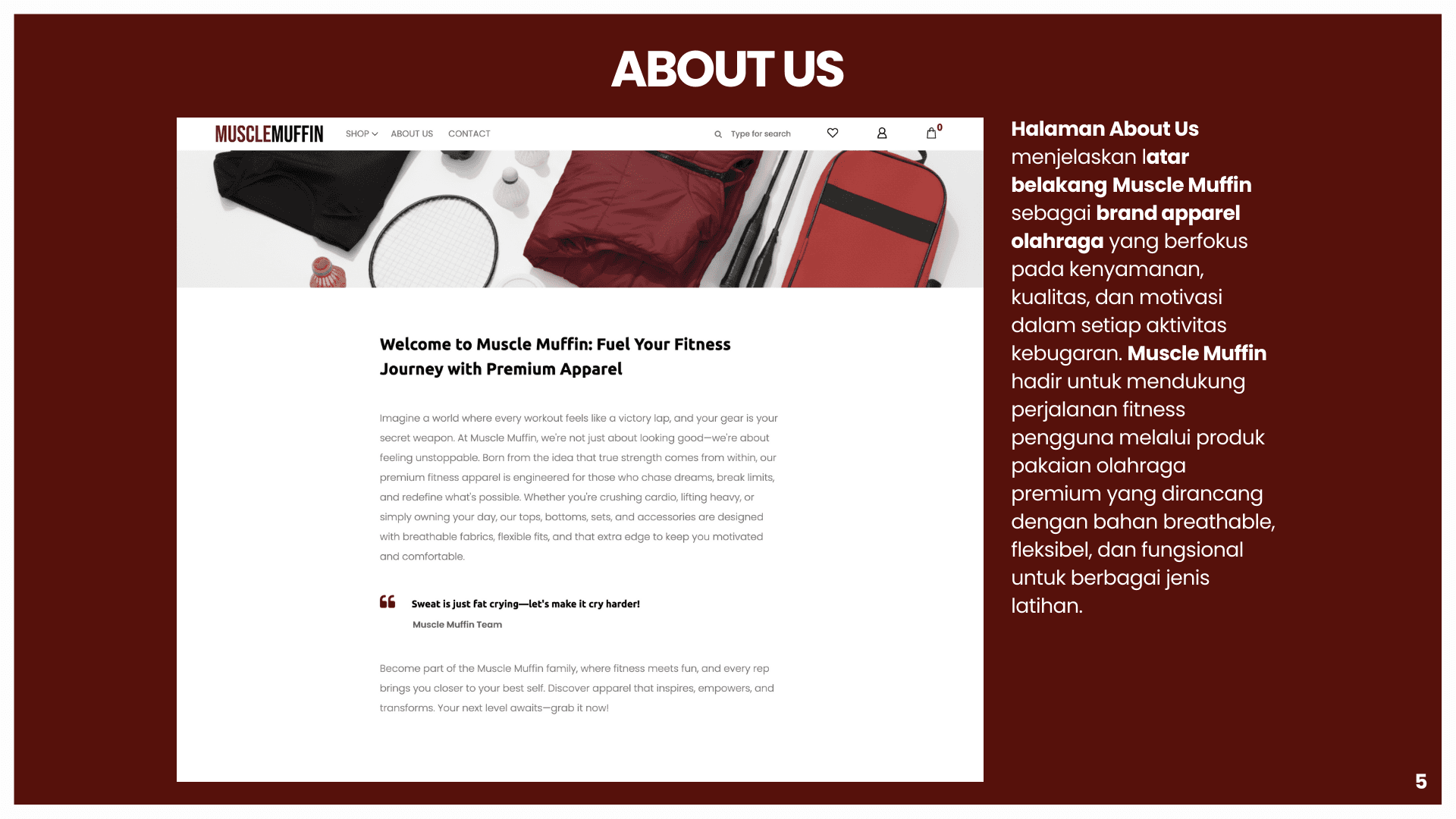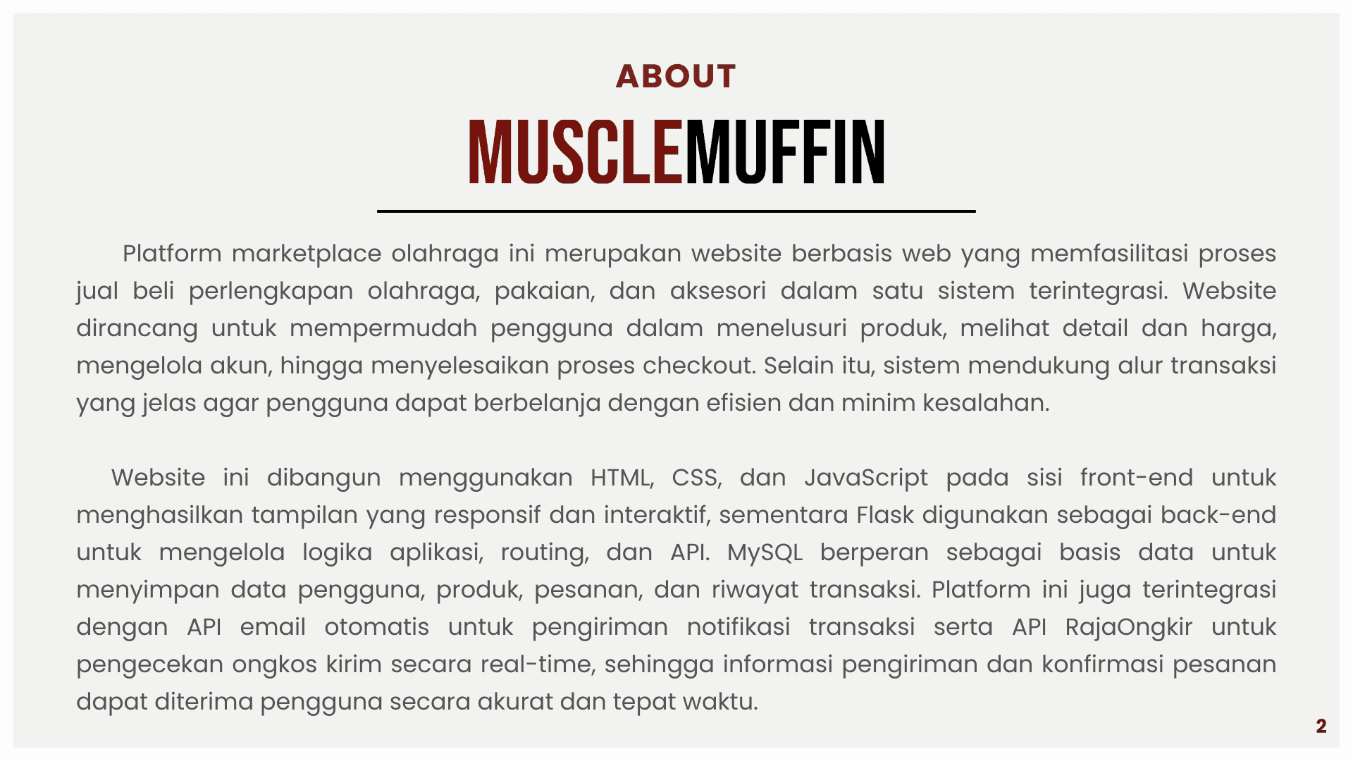This project is about building a sports e-commerce platform called Muscle Muffin to support online buying and selling of sports apparel and accessories in an integrated system. The platform aims to solve problems such as inefficient product browsing, unclear transaction flow, and lack of real-time information. Using a web-based architecture, data for users, products, orders, and transactions are managed in a centralized database using MySQL and Flask. The system is developed with HTML, CSS, and JavaScript for the front end, and integrates features such as coupon management, automated email notifications, and the RajaOngkir API for real-time shipping cost calculation. This helps both customers and administrators track orders, manage products, and run the store more efficiently and accurately.