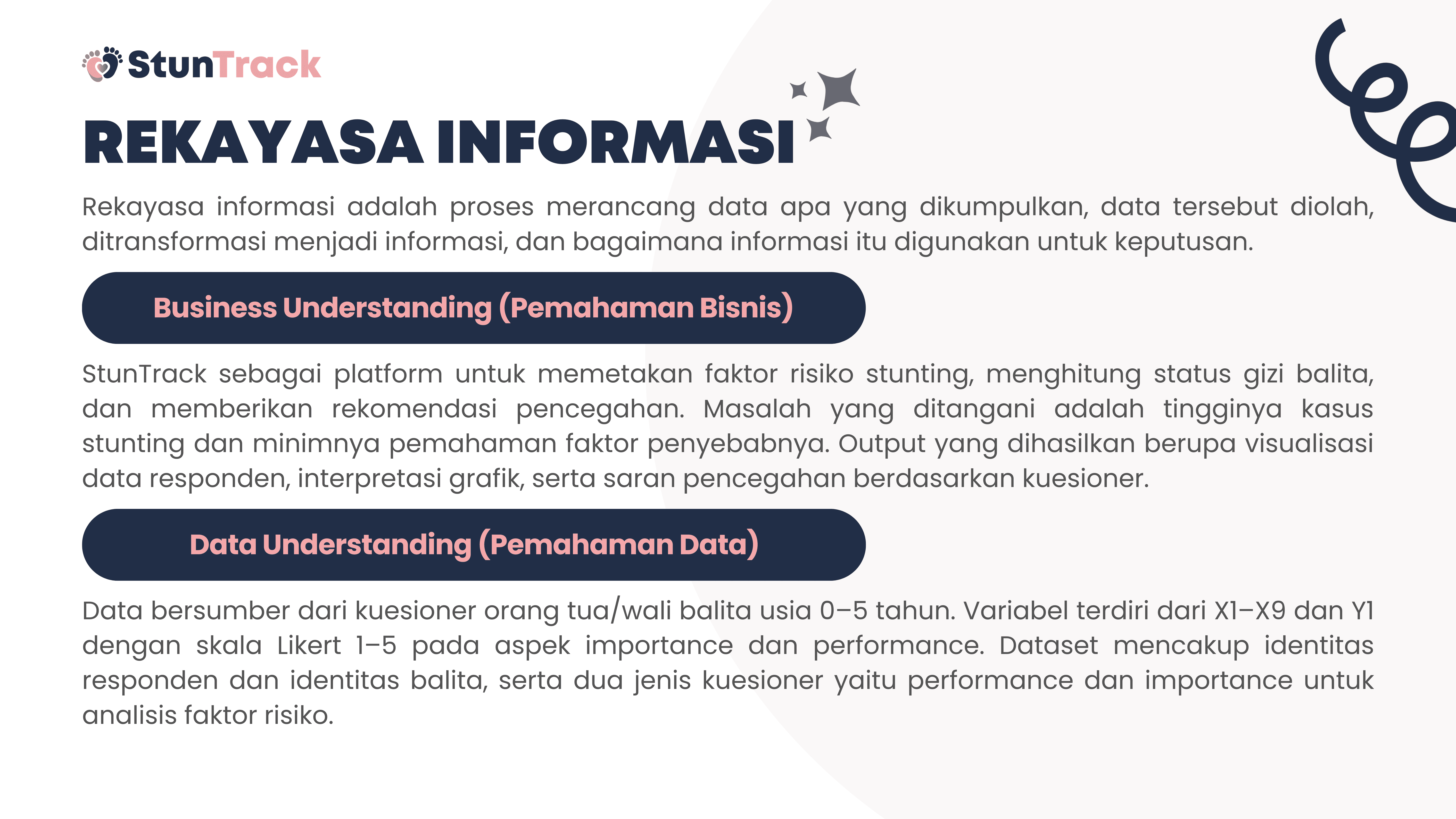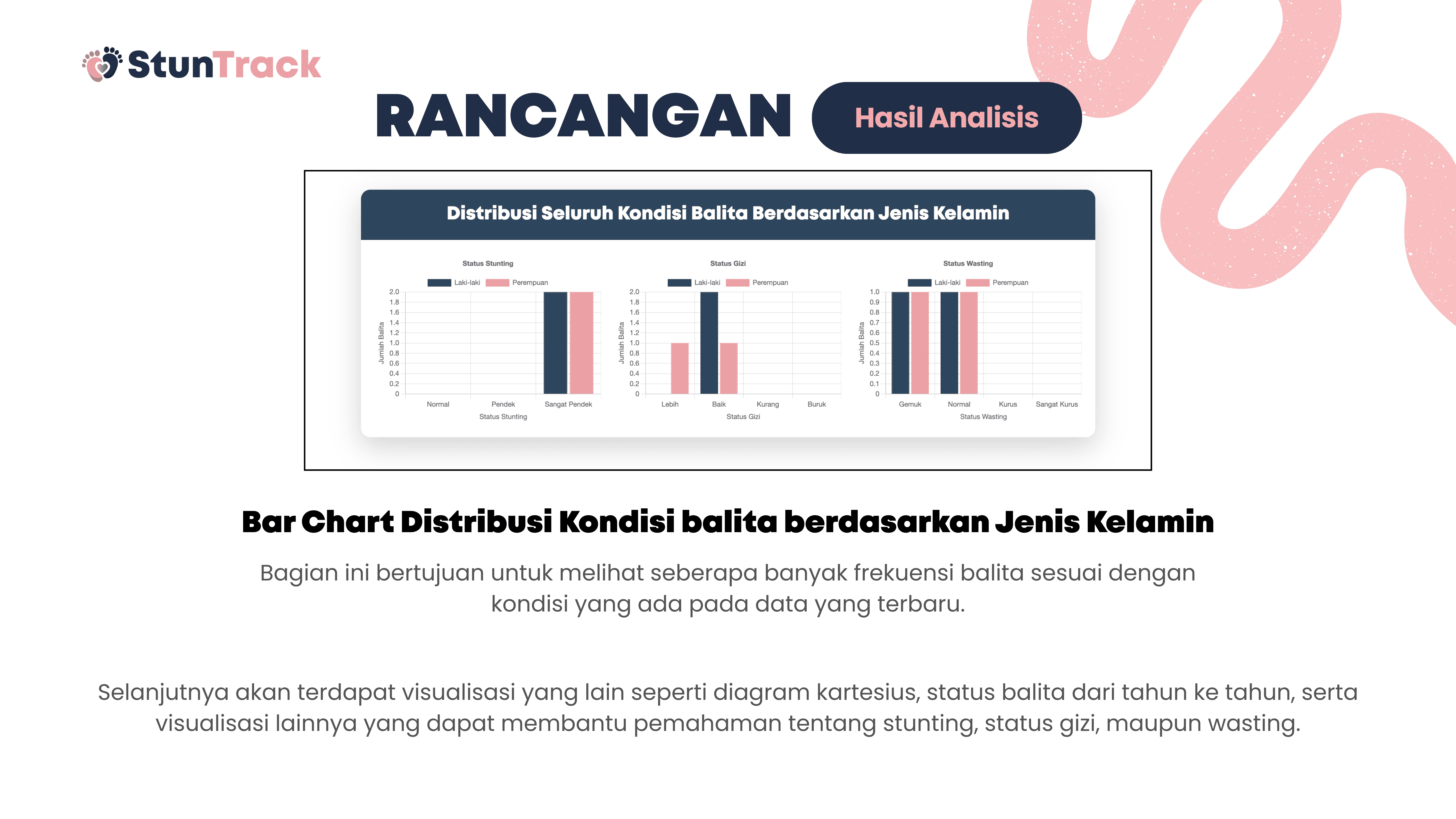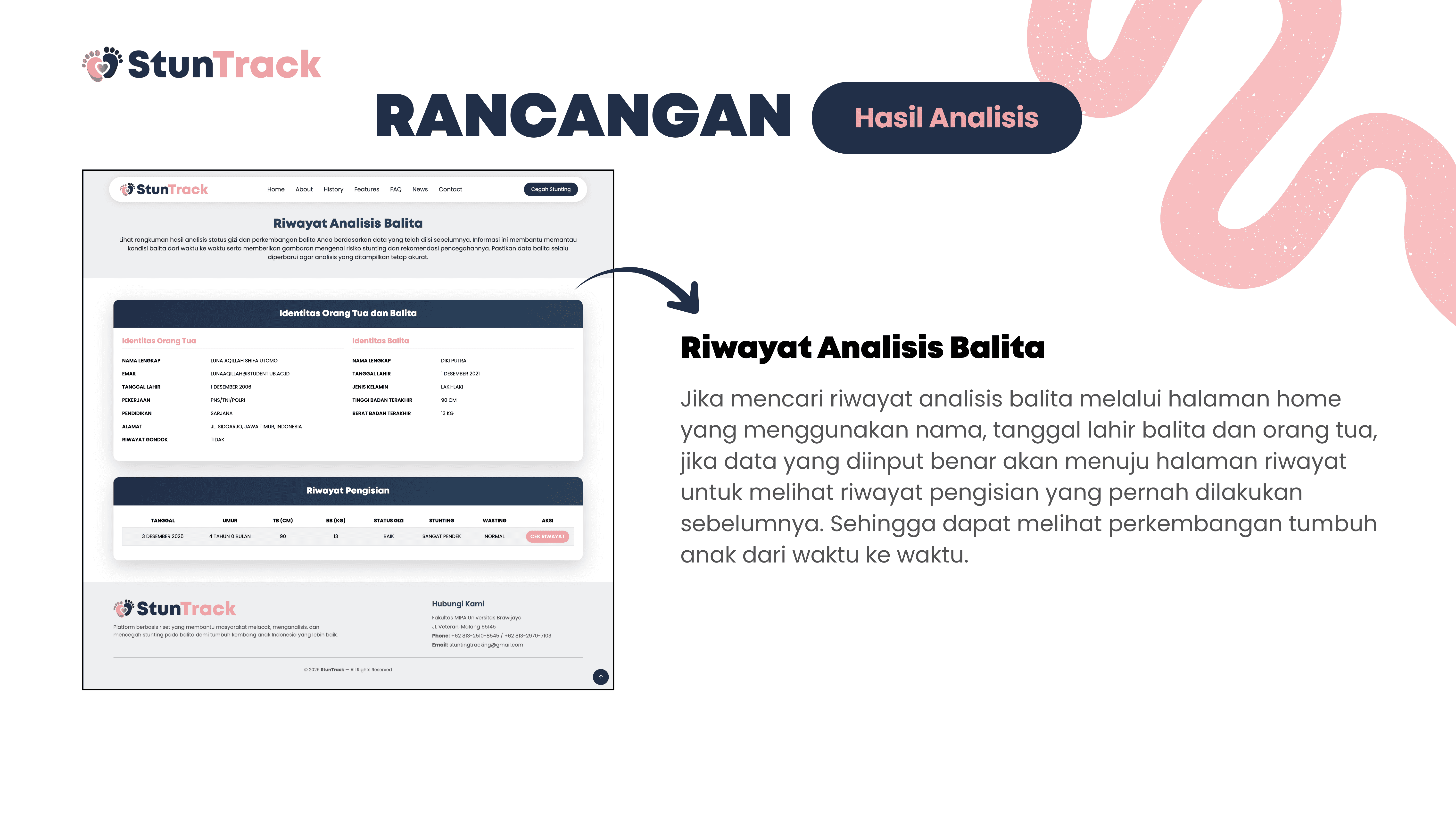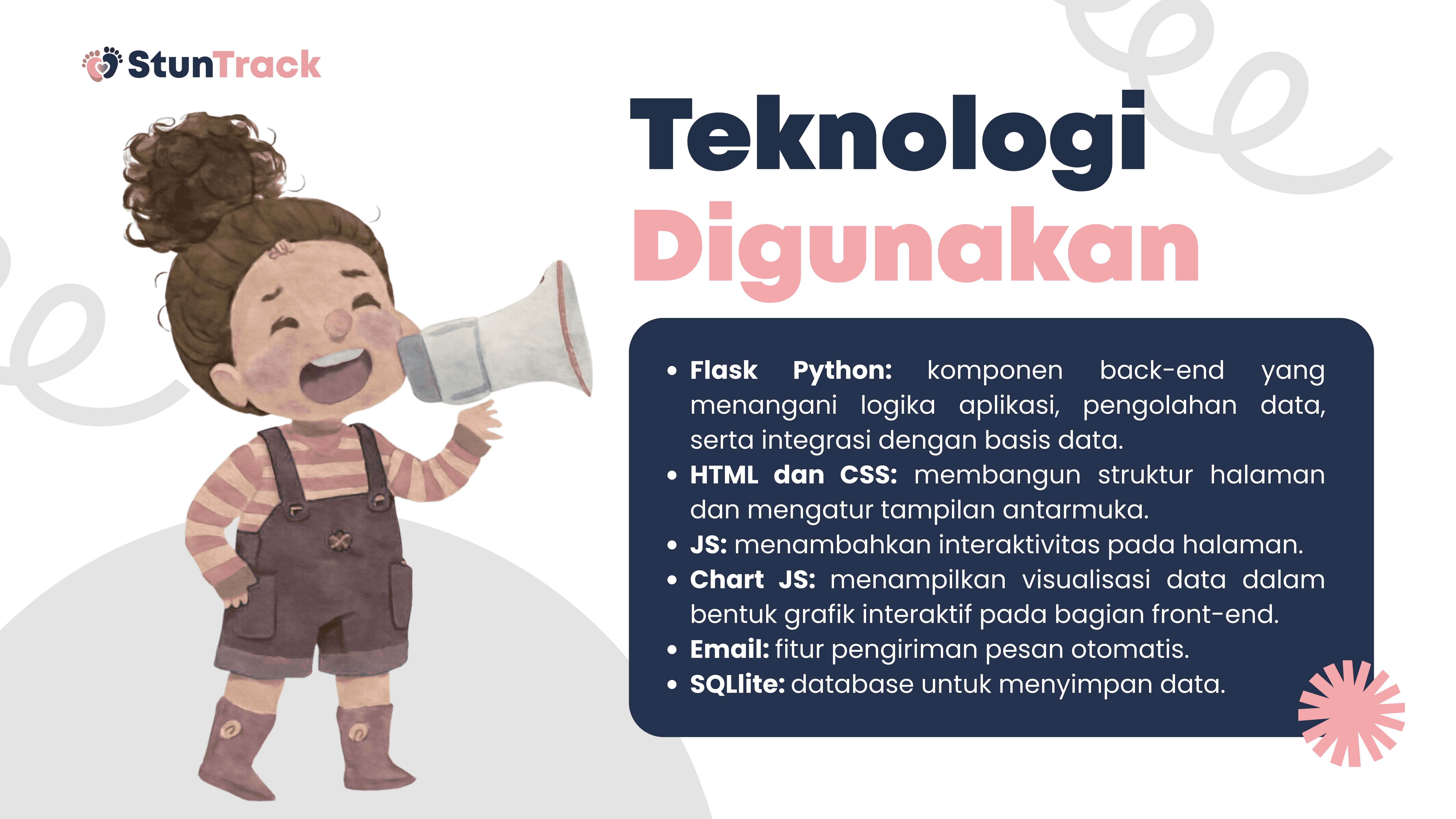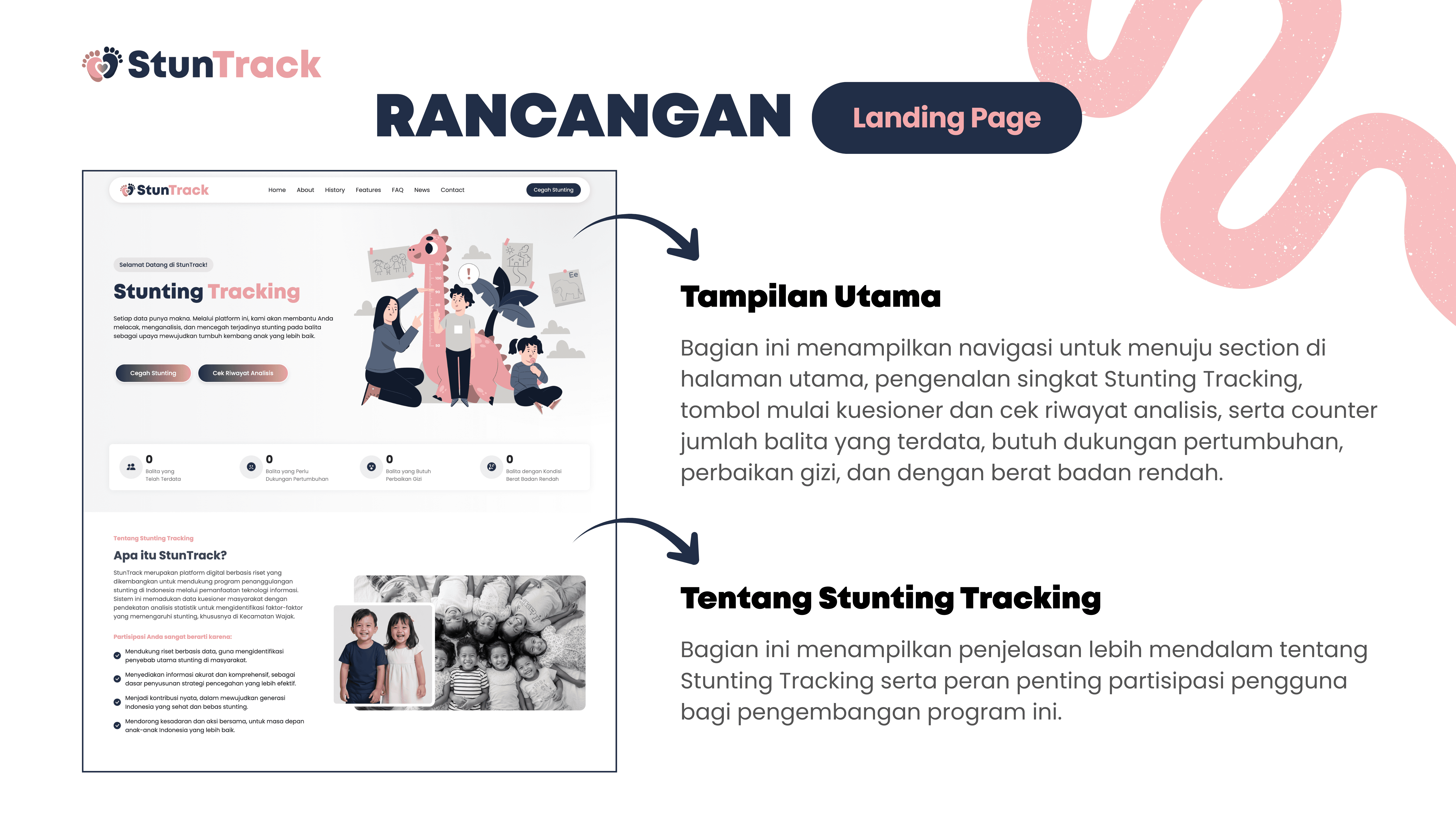 This project is about building StunTrack, a web-based platform to track, analyze, and help prevent stunting in children aged 0–5 years. The system aims to process questionnaire data from parents or guardians to determine nutritional status, identify key stunting risk factors, and generate data-driven recommendations. Using Flask and Python, the data is collected, processed, and stored in a centralized SQLite database, while HTML, CSS, and JavaScript are used for the user interface. Data is visualized with Chart.js and delivered through automated email reports, helping health workers and families monitor child growth and make more informed decisions.