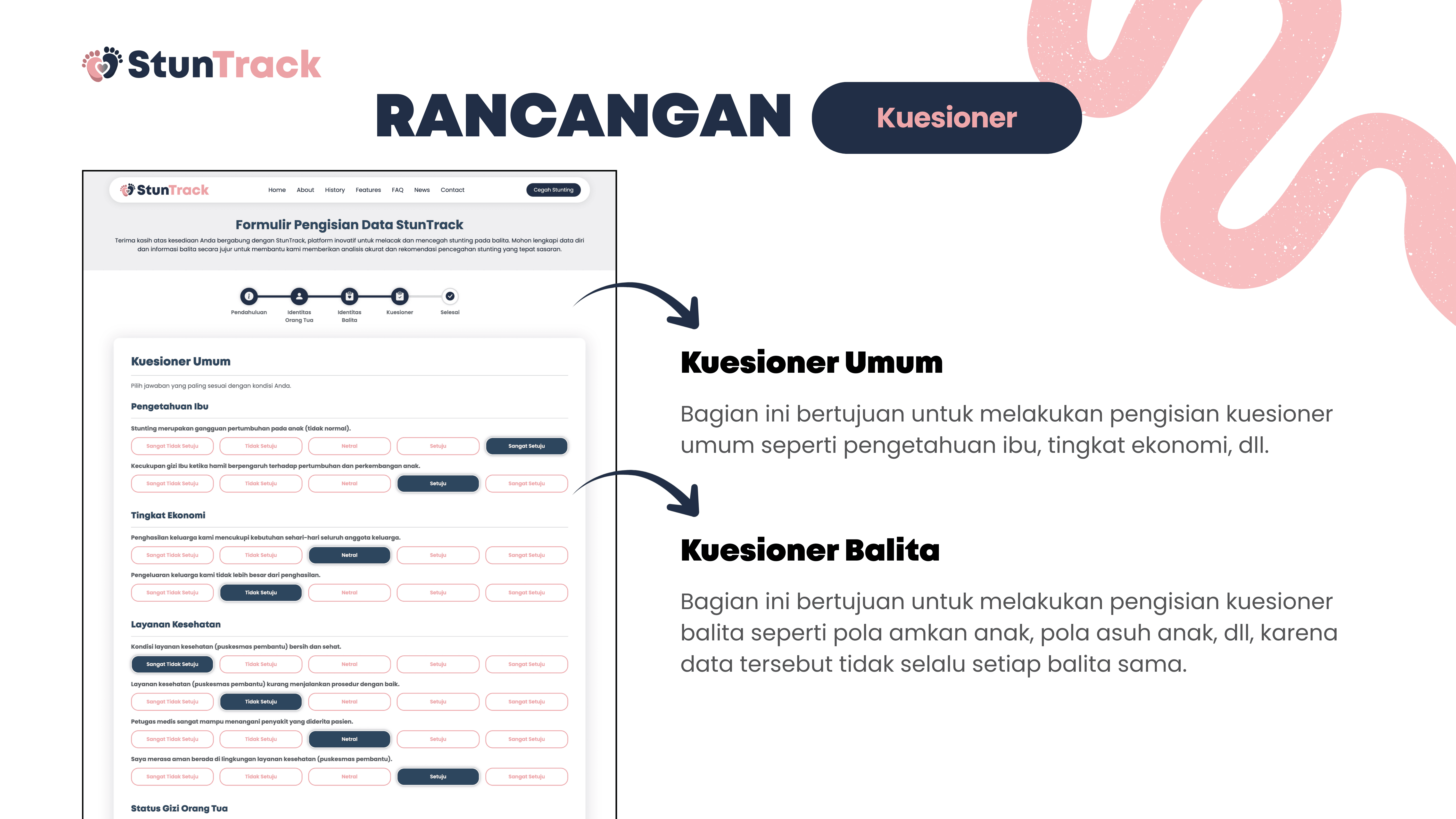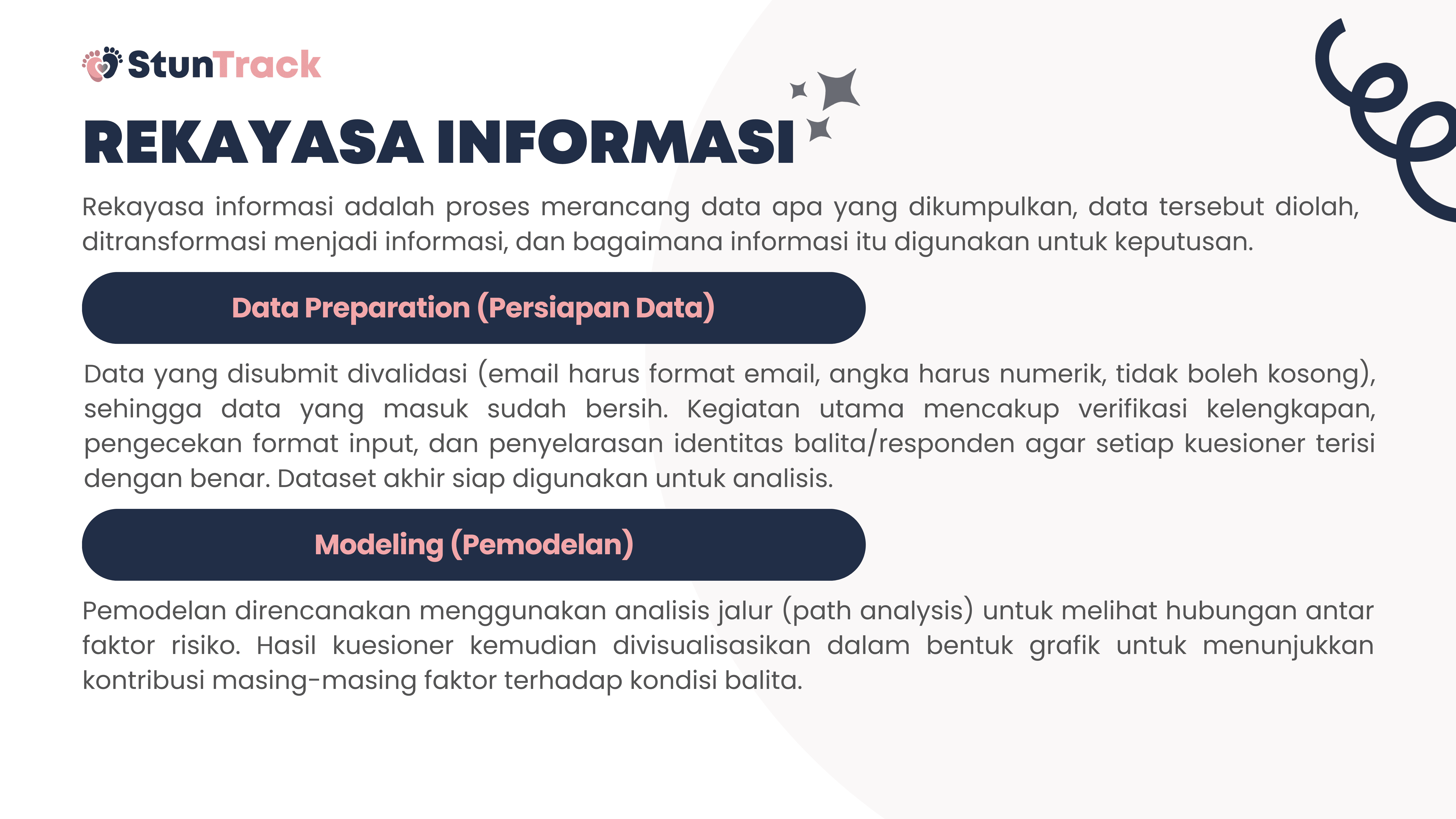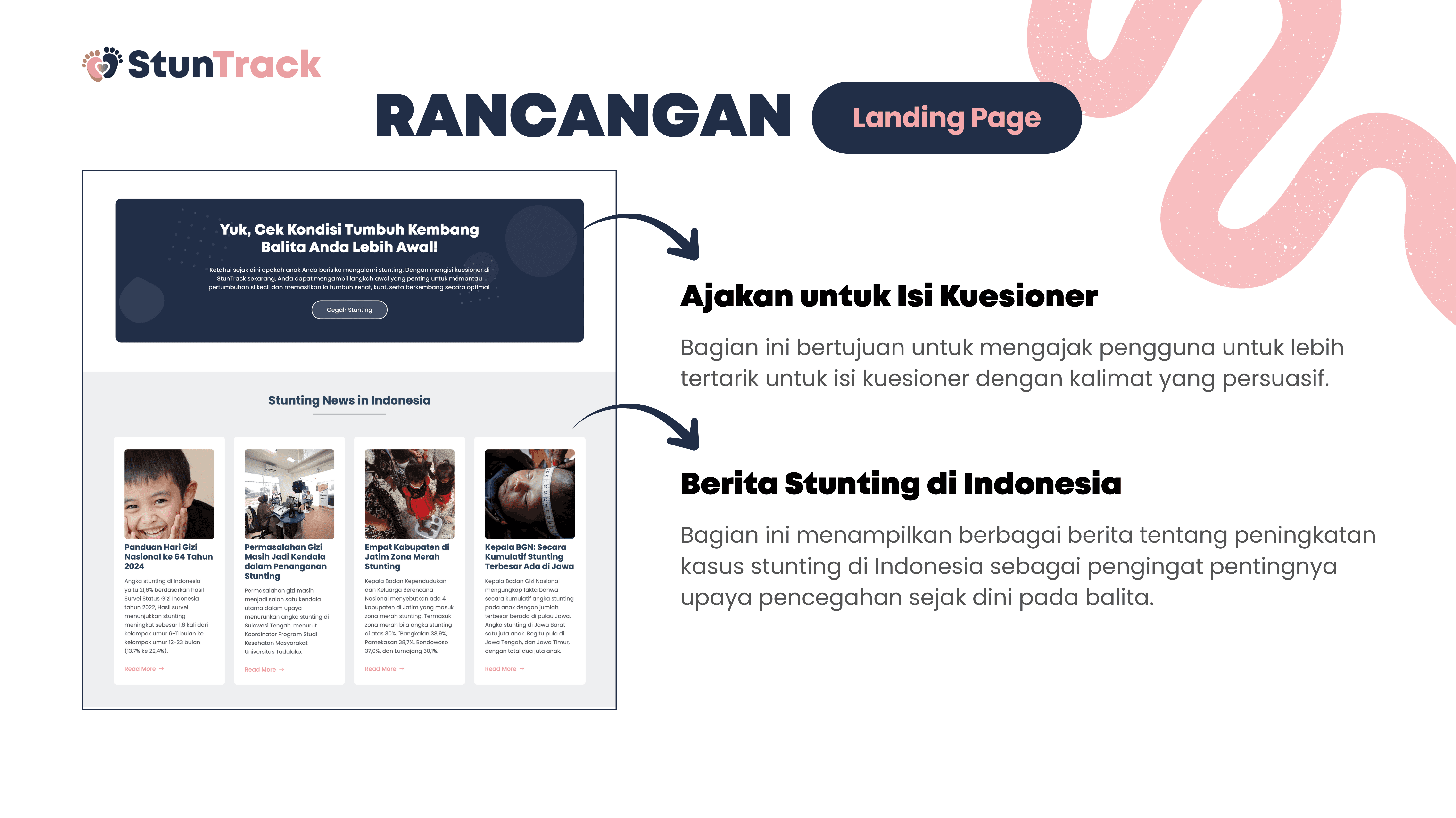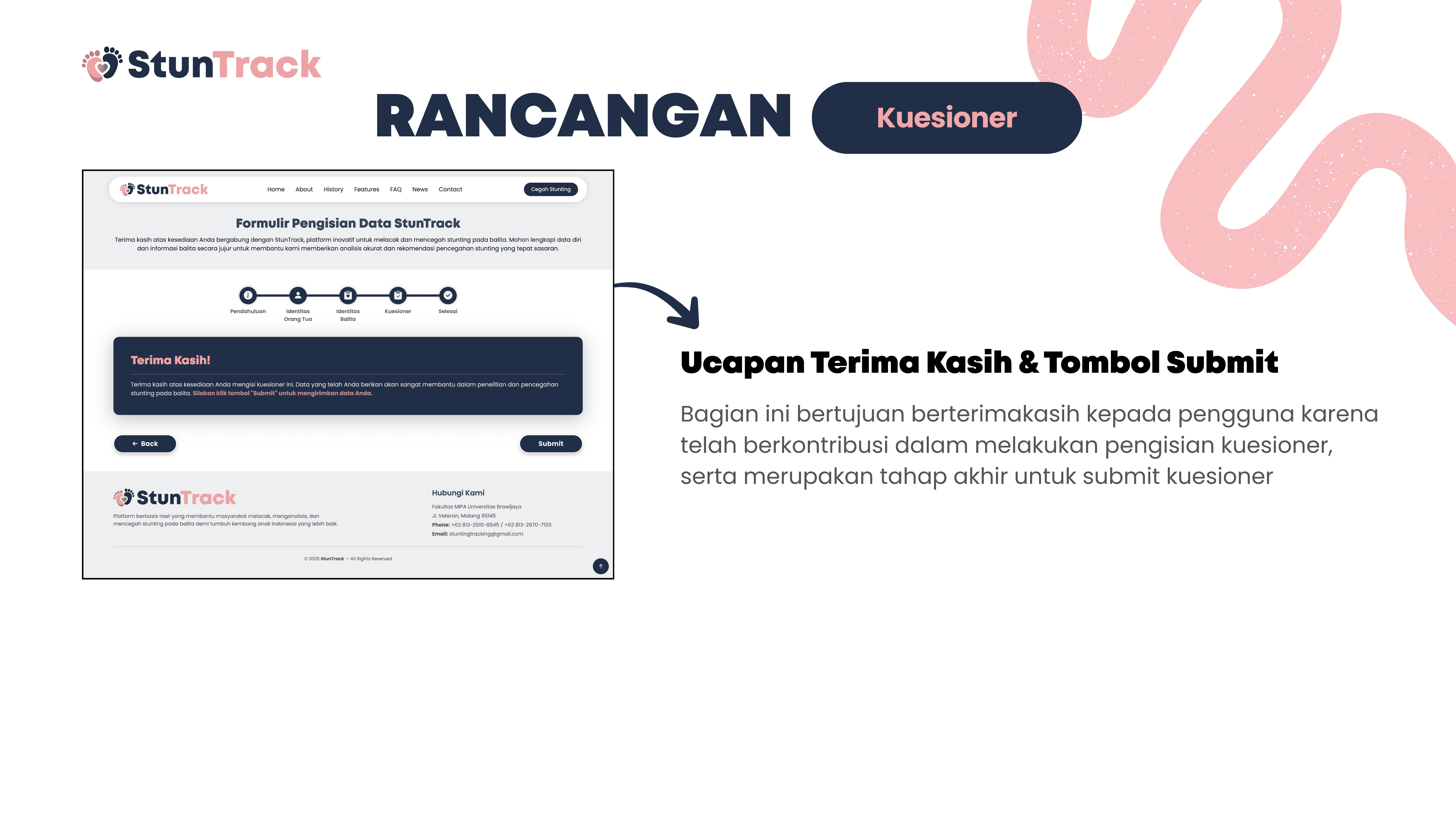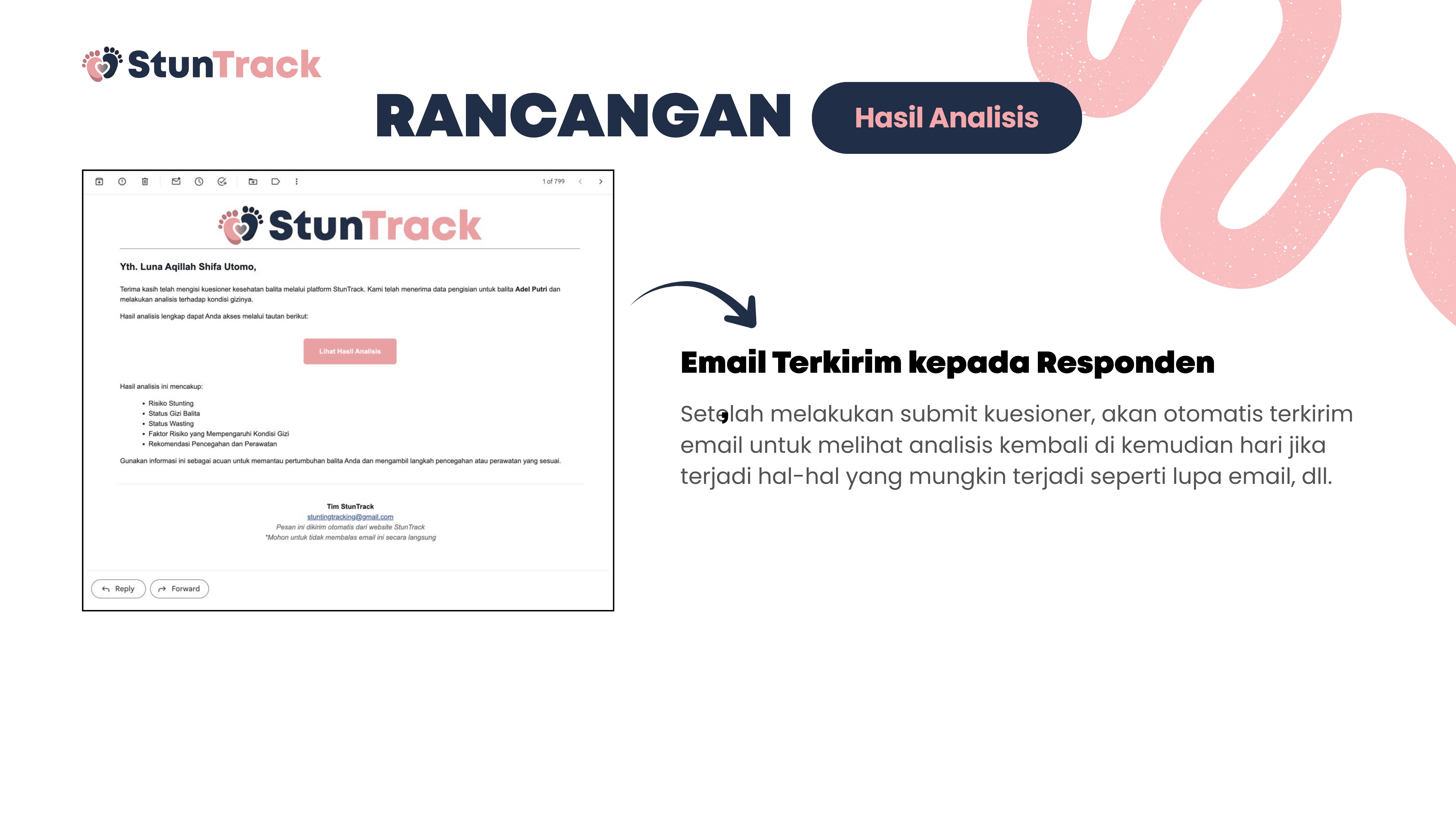 This project is about building StunTrack, a web-based platform to track, analyze, and help prevent stunting in children aged 0–5 years. The system aims to process questionnaire data from parents or guardians to determine nutritional status, identify key stunting risk factors, and generate data-driven recommendations. Using Flask and Python, the data is collected, processed, and stored in a centralized SQLite database, while HTML, CSS, and JavaScript are used for the user interface. Data is visualized with Chart.js and delivered through automated email reports, helping health workers and families monitor child growth and make more informed decisions.