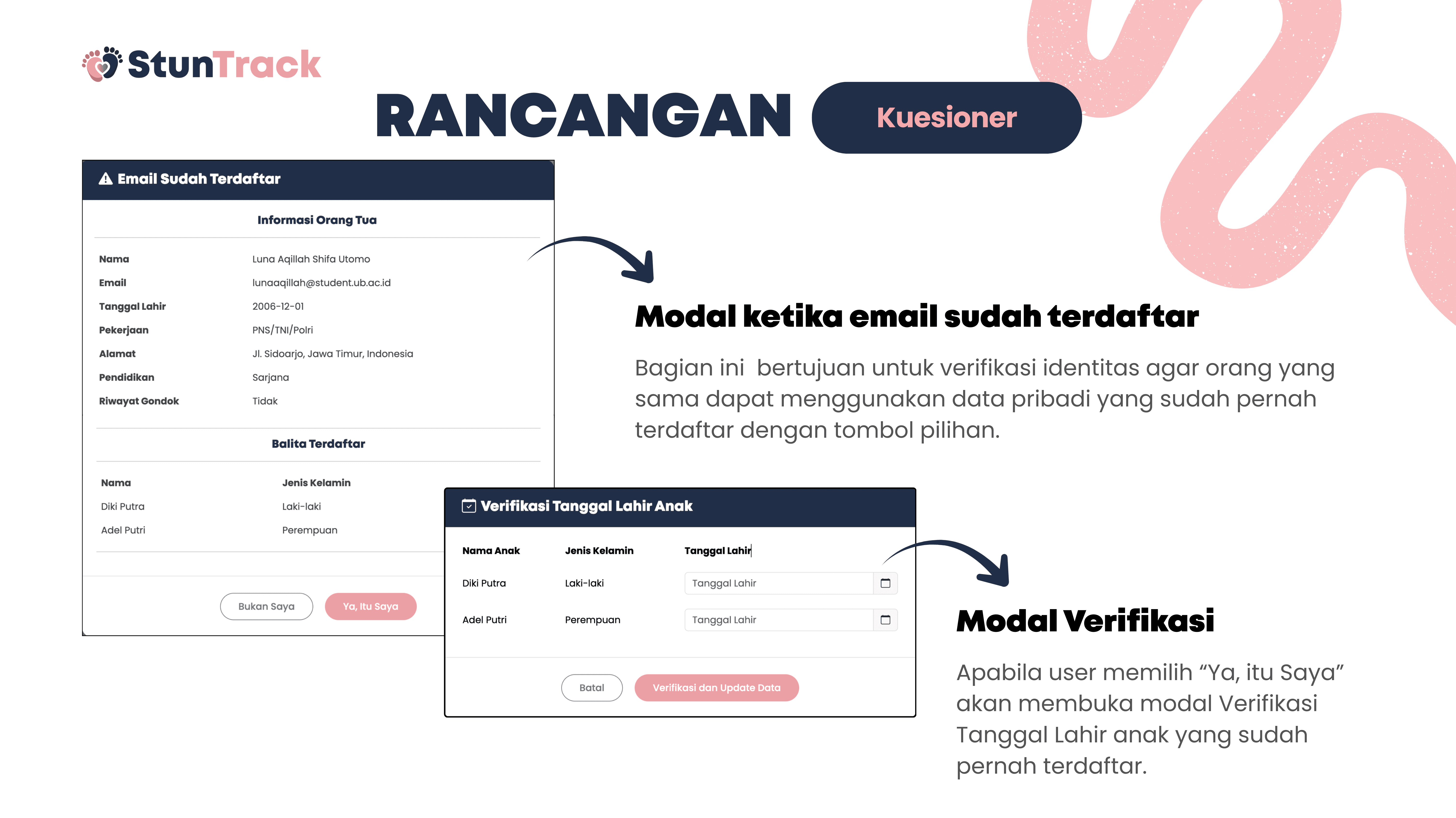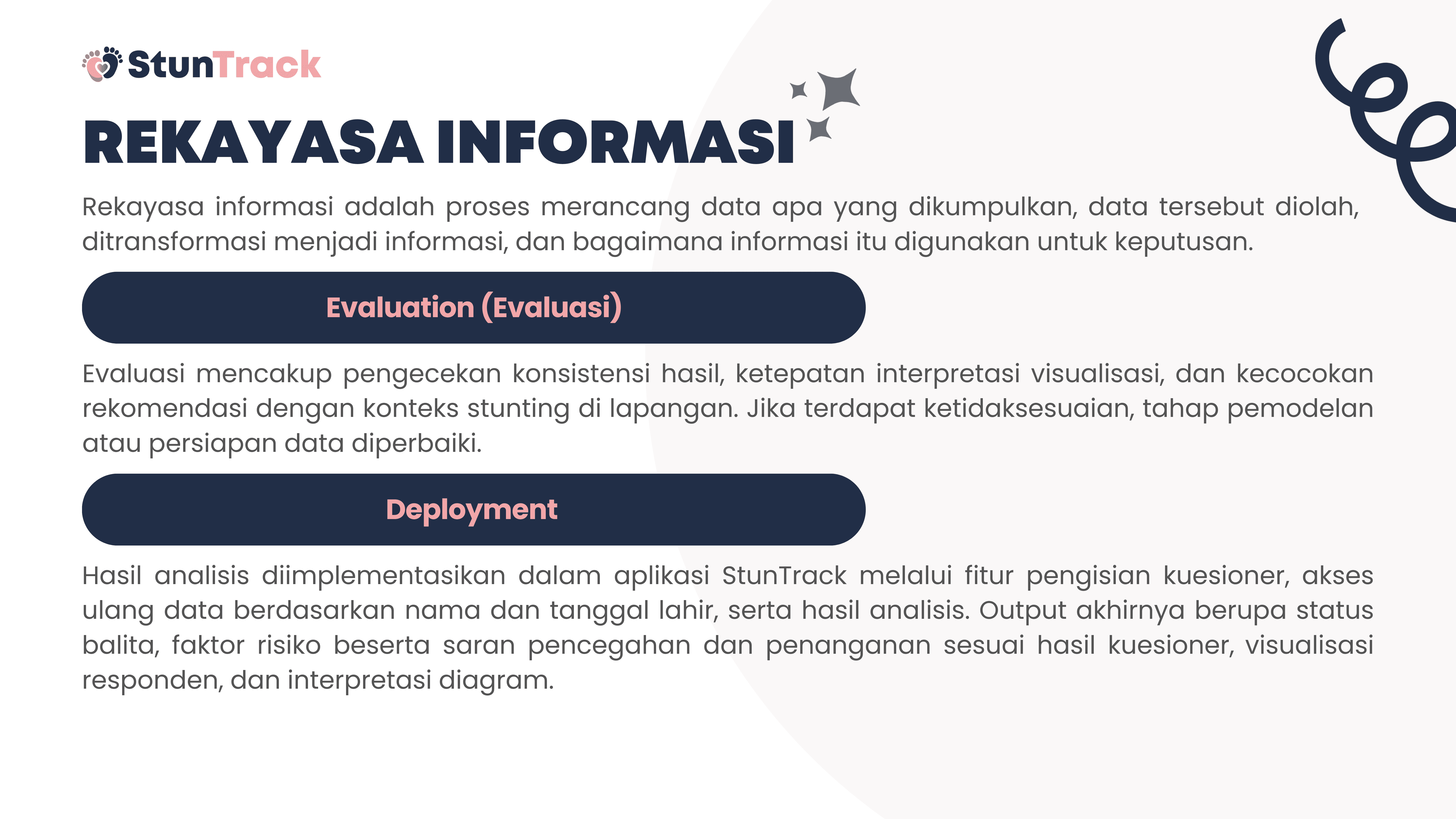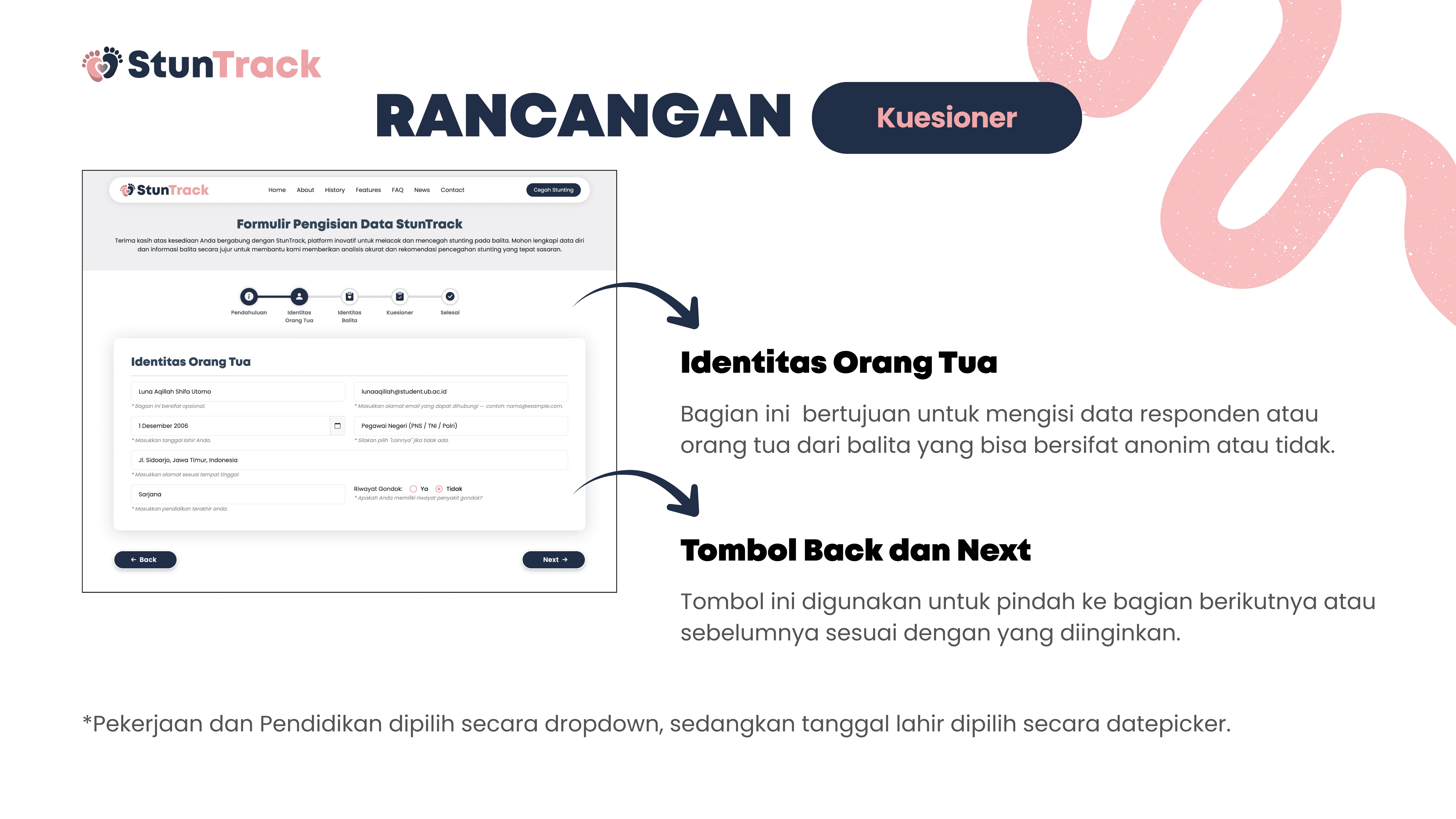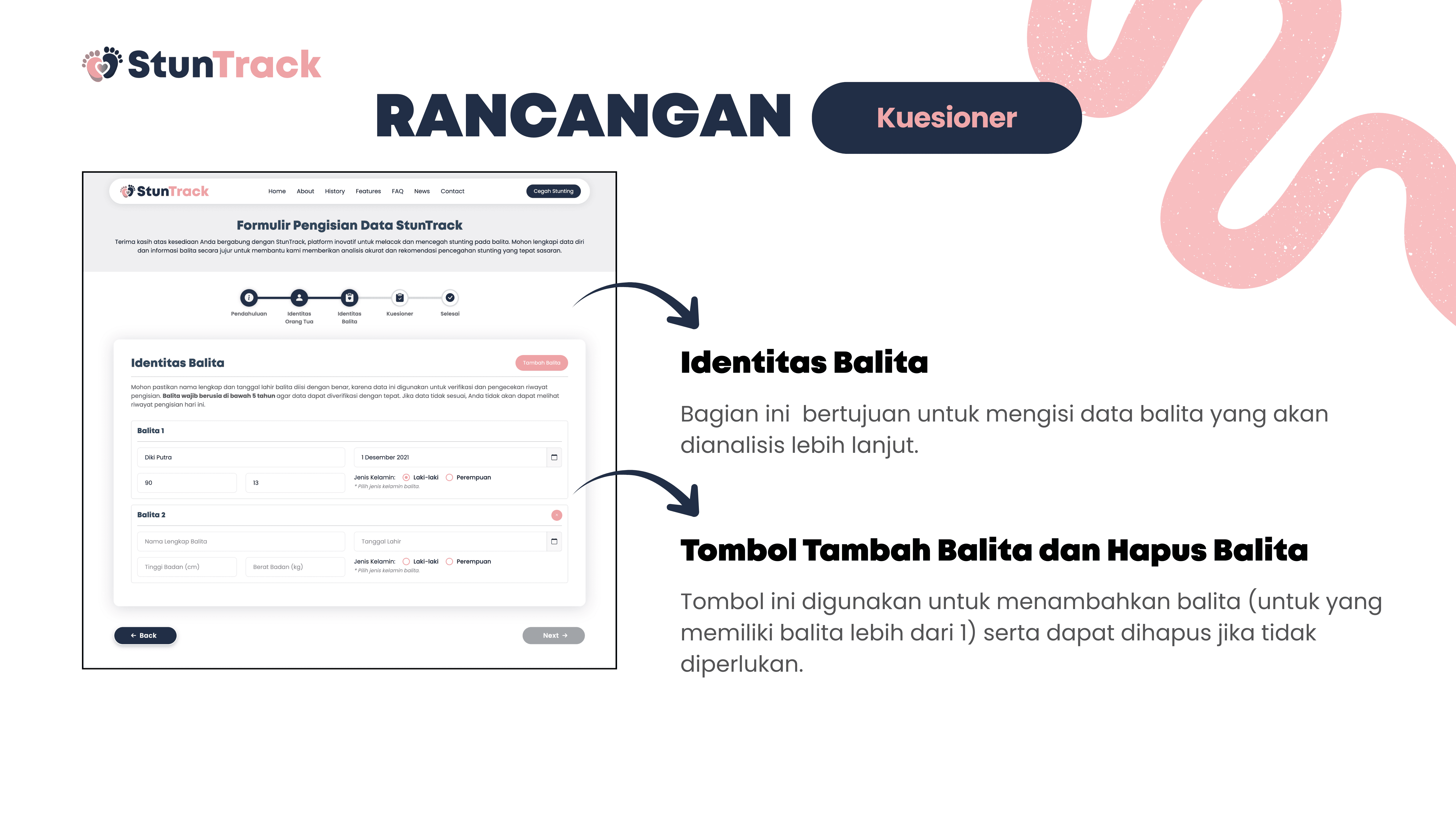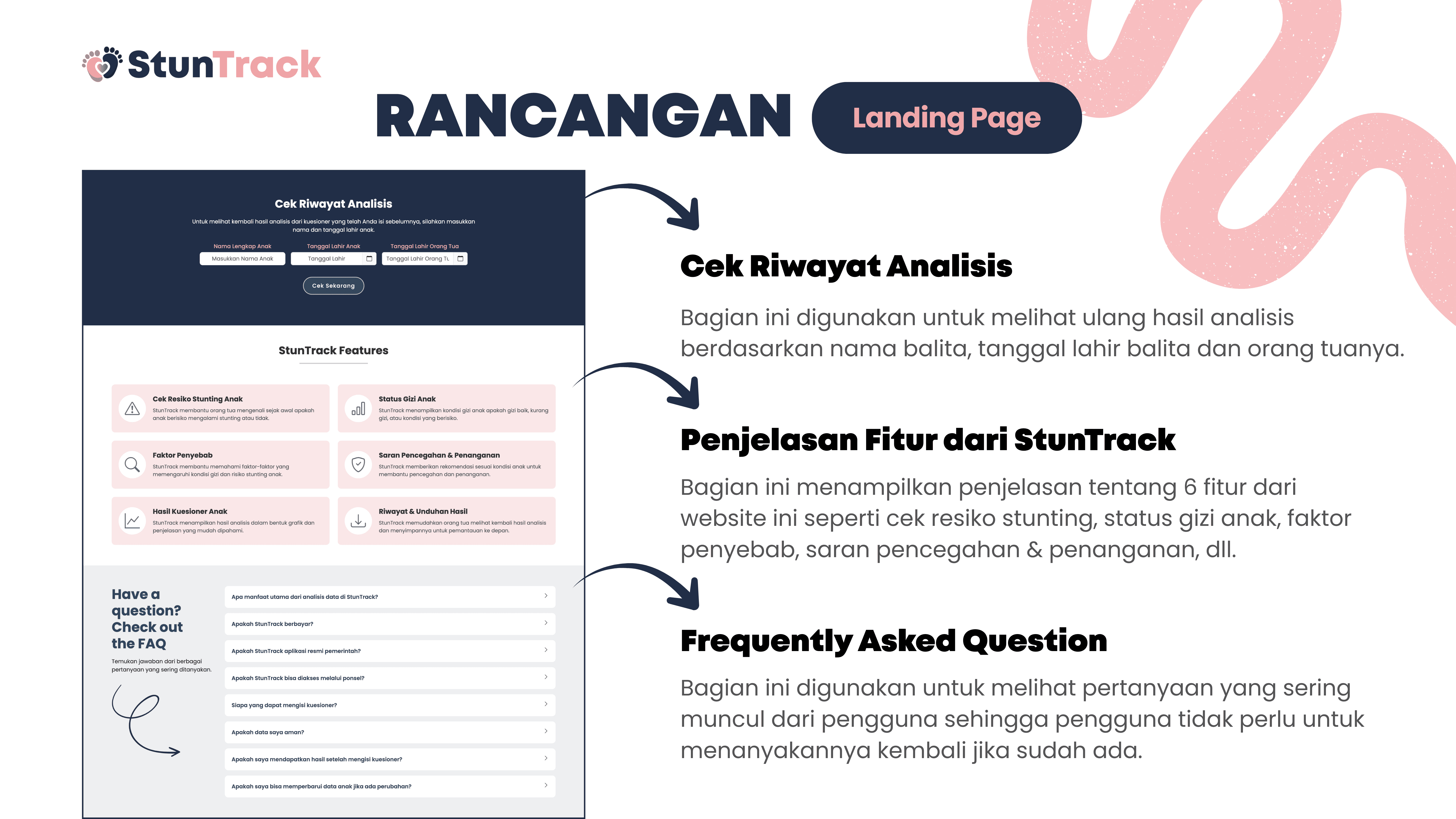 This project is about building StunTrack, a web-based platform to track, analyze, and help prevent stunting in children aged 0–5 years. The system aims to process questionnaire data from parents or guardians to determine nutritional status, identify key stunting risk factors, and generate data-driven recommendations. Using Flask and Python, the data is collected, processed, and stored in a centralized SQLite database, while HTML, CSS, and JavaScript are used for the user interface. Data is visualized with Chart.js and delivered through automated email reports, helping health workers and families monitor child growth and make more informed decisions.