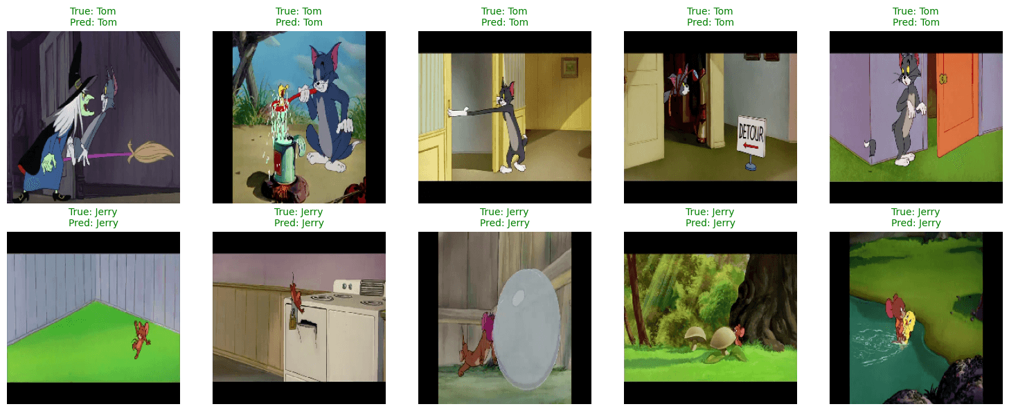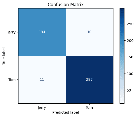 These results indicate that the model is highly accurate in distinguishing between the two classes, with very few misclassifications. The low number of errors on both sides suggests the model has learned the distinguishing features of Tom and Jerry well, without showing significant bias toward one class. The performance is balanced, with both classes achieving high precision and recall, reinforcing that the model is reliable and generalizes effectively on unseen data.